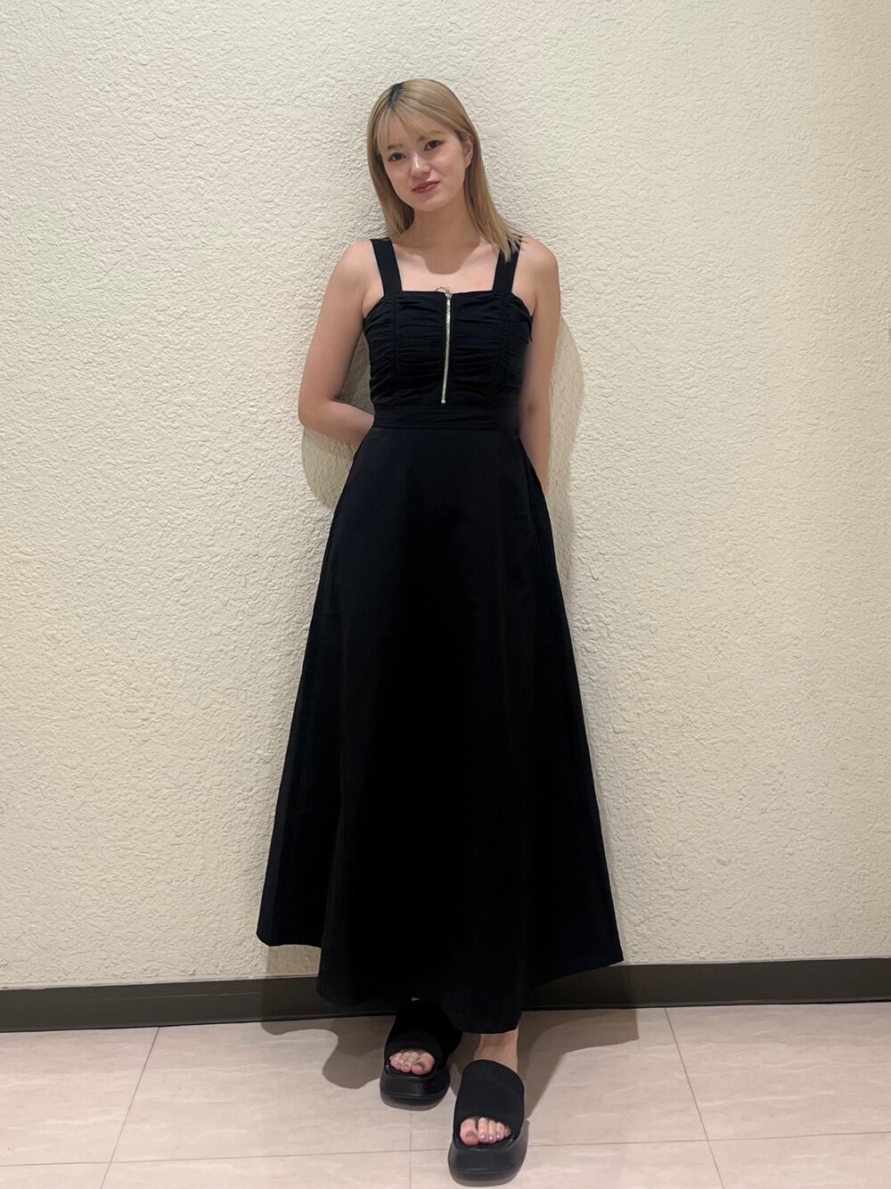 『ワンピコーデ』 [ワンピース]Aラインでウエストが細見えするシルエットです!背中のバックオープンデザインがポイントです!ナイロン素材でサラッと着ていただけます! [サンダル] 普段24.5㎝でLサイズ着用しています!