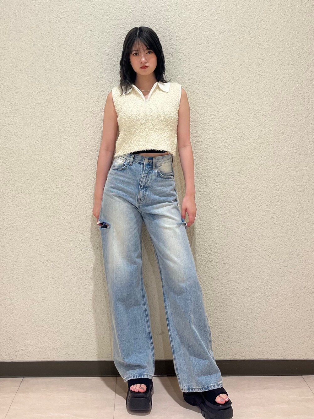 片岡玲菜(EMODA)のデニムパンツ「サイドカットワイドルーズジーンズ」を使ったコーディネート