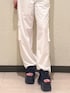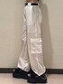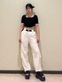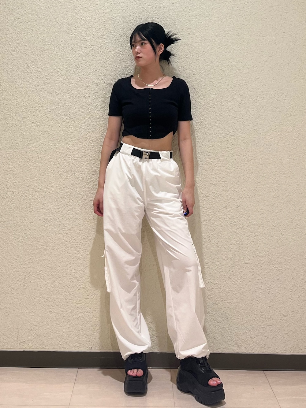 『モノトーンコーデ』 [トップス] おへそ上のショート丈です! 裾がラウンド状になっていて細見えするシルエットです! [パンツ] 裏地付きで透け感気にならず履いていただけます!裾が絞れるので身長関係なく履きやすい長さです! [サンダル] 普段24.5㎝でLサイズ着用しています!