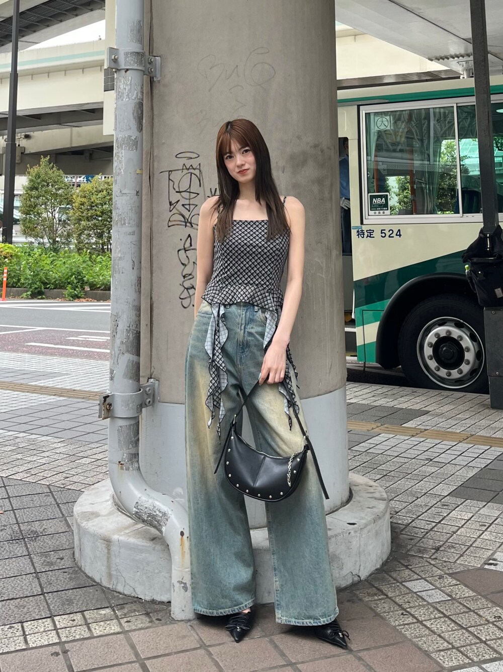 [トップス] 伸縮性のあるシアー素材です! トレンドのフリルデザインがポイント🎀 [デニム] 身長165㎝でSサイズ着用しています! [シューズ] 普段24.5㎝でLサイズ着用しています! [バック] ショルダー長めで肩掛けしやすくなってます!