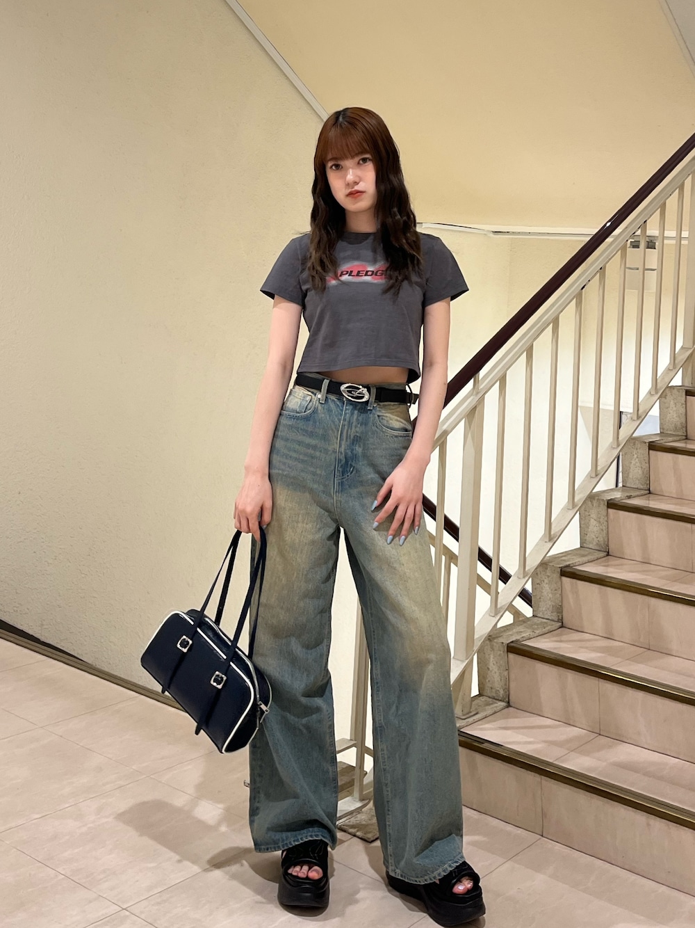 [トップス] おへそ上のショート丈です! [デニム] 身長165㎝でSサイズ着用しています! [サンダル] 普段24.5㎝でLサイズ着用しています! [バック] 500mlのペットボトルが入る大きさです! [ベルト] ストーンデザインがコーデのアクセントになります!
