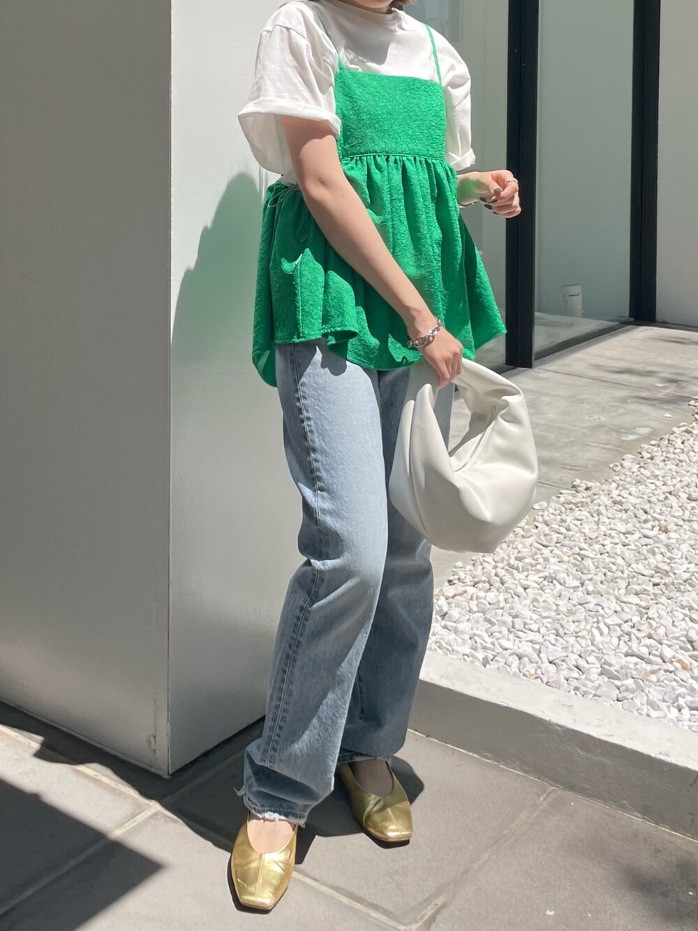 動きやすく、おしゃれ見えするドライブコーデ🚗 《IG: @shion_tada_の投稿詳細》 【Tシャツ】ベーグルの絵が描いてある遊び心あるTシャツ👕袖部分はゆったりしていて、脇周りもピタッとしてないので脇汗も気にせずに着れちゃいますよ!!🤣🤍丈は152センチの私が結ばずに着て、お尻隠れるくらいです! 【キャミ】トレンド感のあるジャガードキャミ🟢紐の部分は長さの調節もできるようになっています❕ギャザーが上の位置にあるので、脚長効果抜群です✨ 【デニム】152センチ24inch着用。スニーカーでもフラットでも大丈夫でした✨ ハイウエストなのでスッキリ履きたい方にもおすすめのデニムです! 腰回りはスッキリシルエットで、ウエスト部分もホックではなく、ボタンなのでよりフィットします! 【バック】フェイクレザーなので、汚れも気にせず使えます◎ ころんとしたシルエットも可愛い❤️ ※サンダルはスタッフ私物
