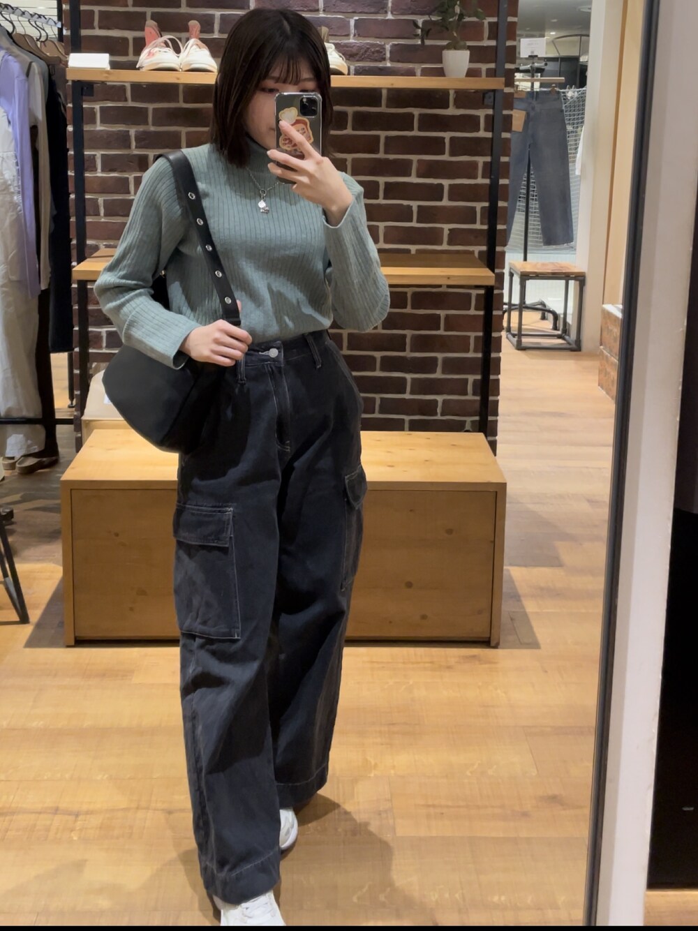 シンプルコーデ🫐 【タートルネック】 お手入れ楽ちん!洗えるタートルネック!リアルバイ♡ タートルネック部分は高すぎないので、丸顔の私でも大丈夫でした◎ そして、ピタッとしすぎないシルエットも使いやすいポイントです! 丈感は、152センチでお尻の半分くらいまででした! 【デニム】 152センチSサイズ着用。 ウエストは、フィットしてくれるサイズ感で、丈感は152センチで地面から1センチ離れるくらいの丈感です! スッキリ履きたい方はブーツ合わせがおすすめですが、ゆったりカジュアルに履きたい方にはスニーカー合わせがおすすめです♡ 大きめのポケットデザインも可愛いです! リアルバイ✨ 【ネックレス】 胸元あたりまでくる長さで、コインのデザインが可愛いネックレス✨ コーデのアクセントになりますよ❤ 【バック】 フェイクレザーで汚れ気にせず使えていいですよね❤ 触り心地も柔らかく、使いやすいです! ベルト部分で長さの調節もできます! ※スニーカーはスタッフ私物