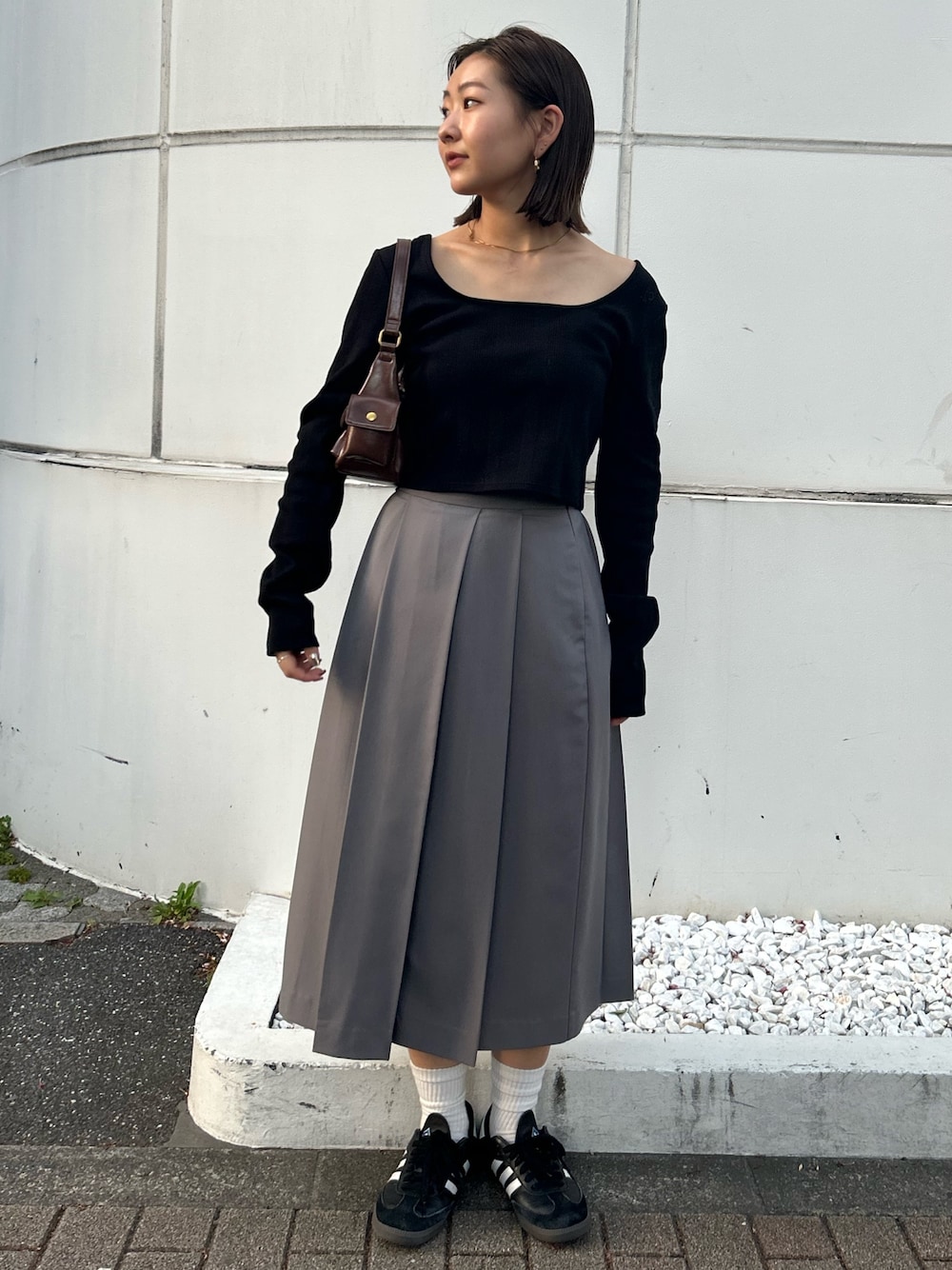【トップス】 スクエアネックなので、デコルテ部分をスッキリ見せてくれます! ショート丈でハイウエストのアイテムと相性GOODです♡ 【スカート】 今年トレンドのプリーツスカート! ミドル丈にあえてロングブーツで合わせるのもおすすめです👢 小柄さんも楽しんでいただける丈感になってます!♡