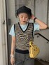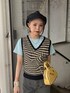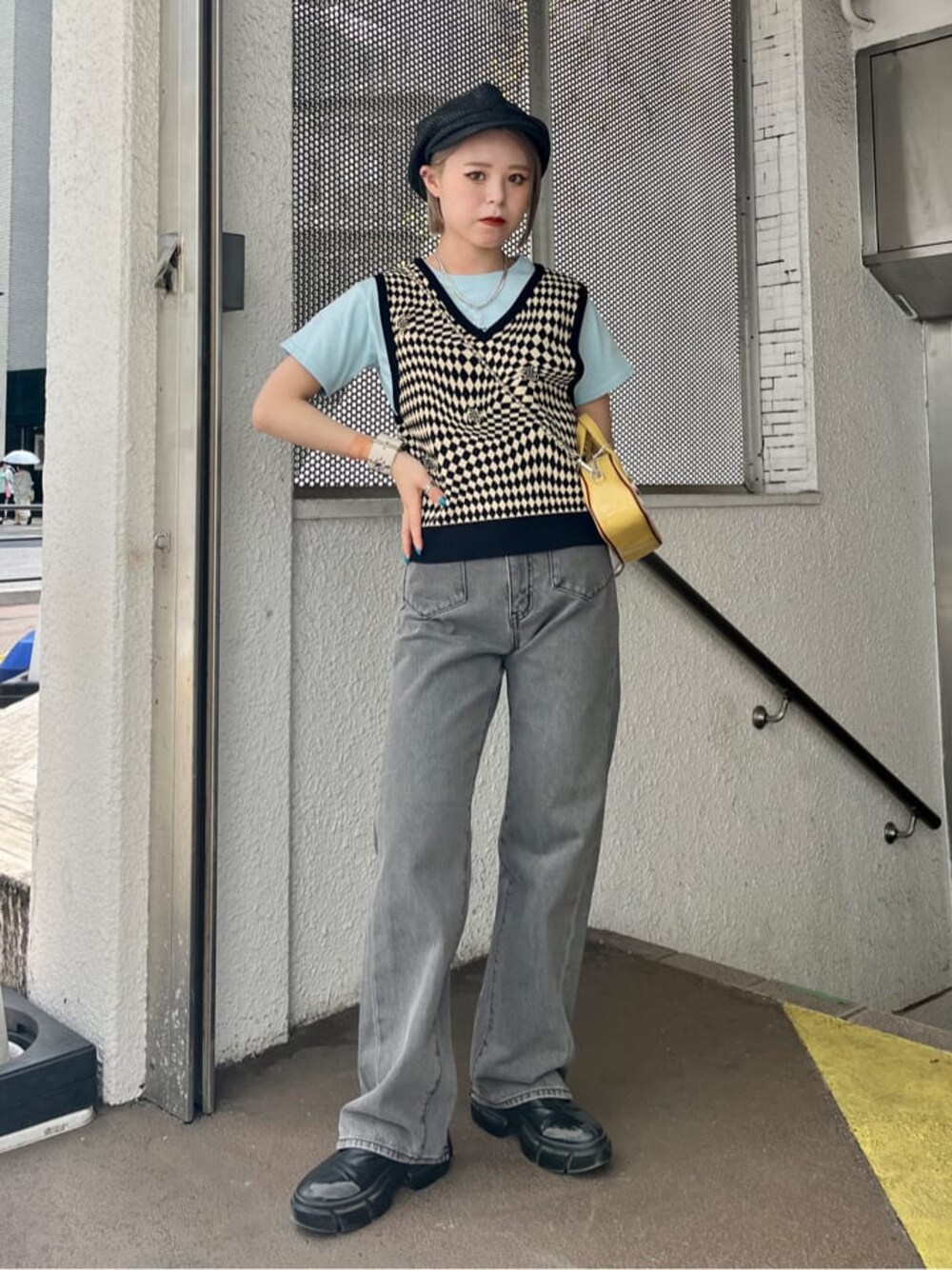 レトロボーイッシュコーデ【ベスト】Uネック、Vネックと前後2wayのサマーニットベスト!1枚でノースリーブで着ても◎コンパクトなサイズ感なのでTシャツをレイヤードする時は小さめがおすすめです!シャリ感があって夏も涼しく着て頂けますよ!【デニム】ZIPの変形型デニム!開けるとフレア、閉めると細めストレートに変身します。153cmの私で少し厚底を履くと丈感ゆるっと着れるので低身長さんも安心して履いて頂けます!【キャスケット】大きめなので、小顔効果◎夏場のコーデのアクセントにも◎