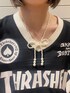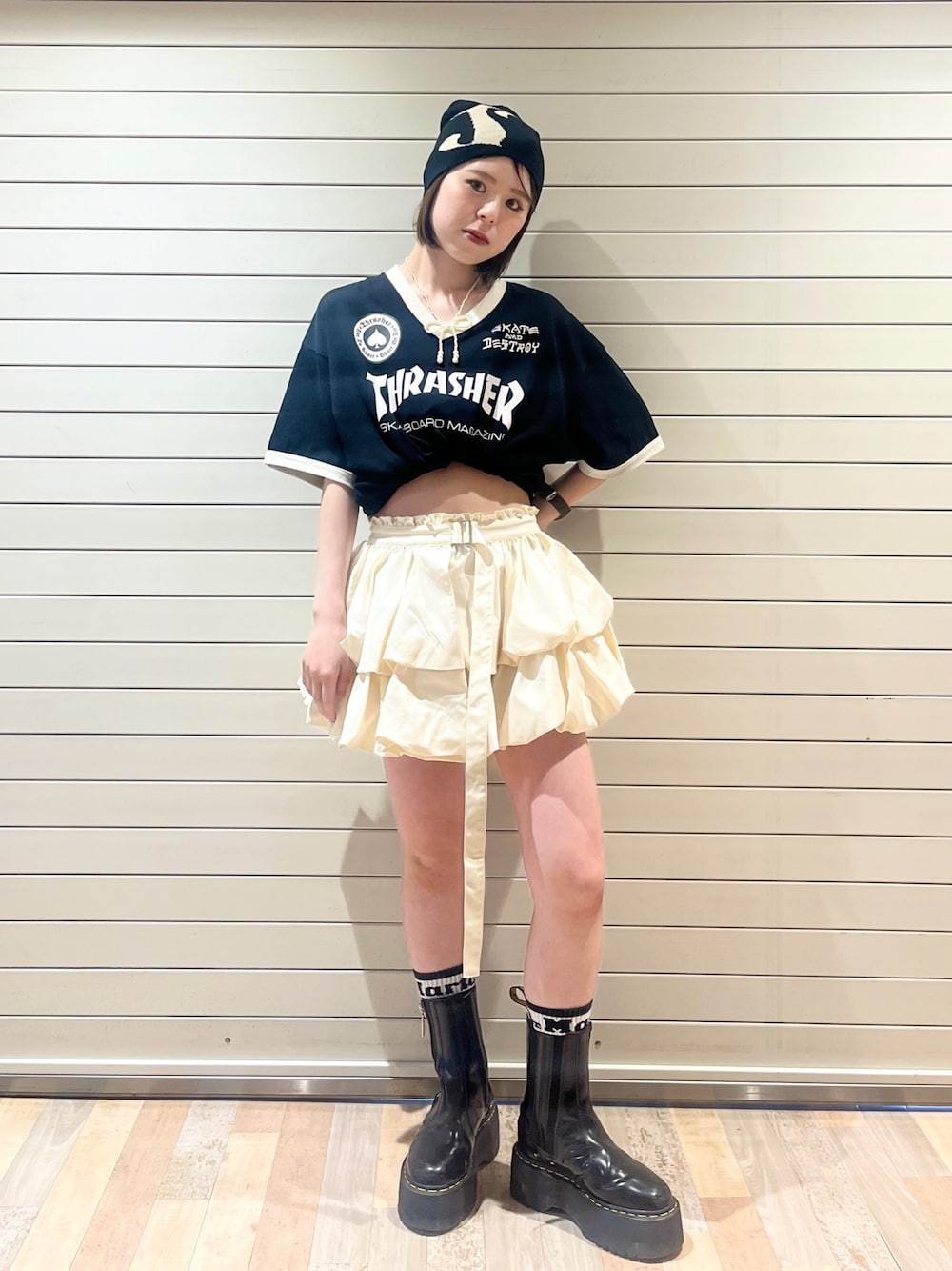 【トップス】THRASHER別注アイテムのTシャツ♦︎今季トレンドのスポーティーなゲームTです!身幅、丈感ゆったりで、ユニセックスで着て頂けるくらいのBIGサイズです!私のように裾をゴムで括り、クロップド丈で着てもスッキリ見えしますよ◎【スカート】今季トレンドのバレエコアが叶うバルーンスカート❤︎コーデに取り入れるだけで甘さがMIXされて可愛くなりますよ!ボリューム感たっぷりのティアードで太ももが細見えするのも嬉しいポイントです! また、スカート、ラップベルト、斜め掛けのつけ襟として幅広くお使い頂けます⭐︎