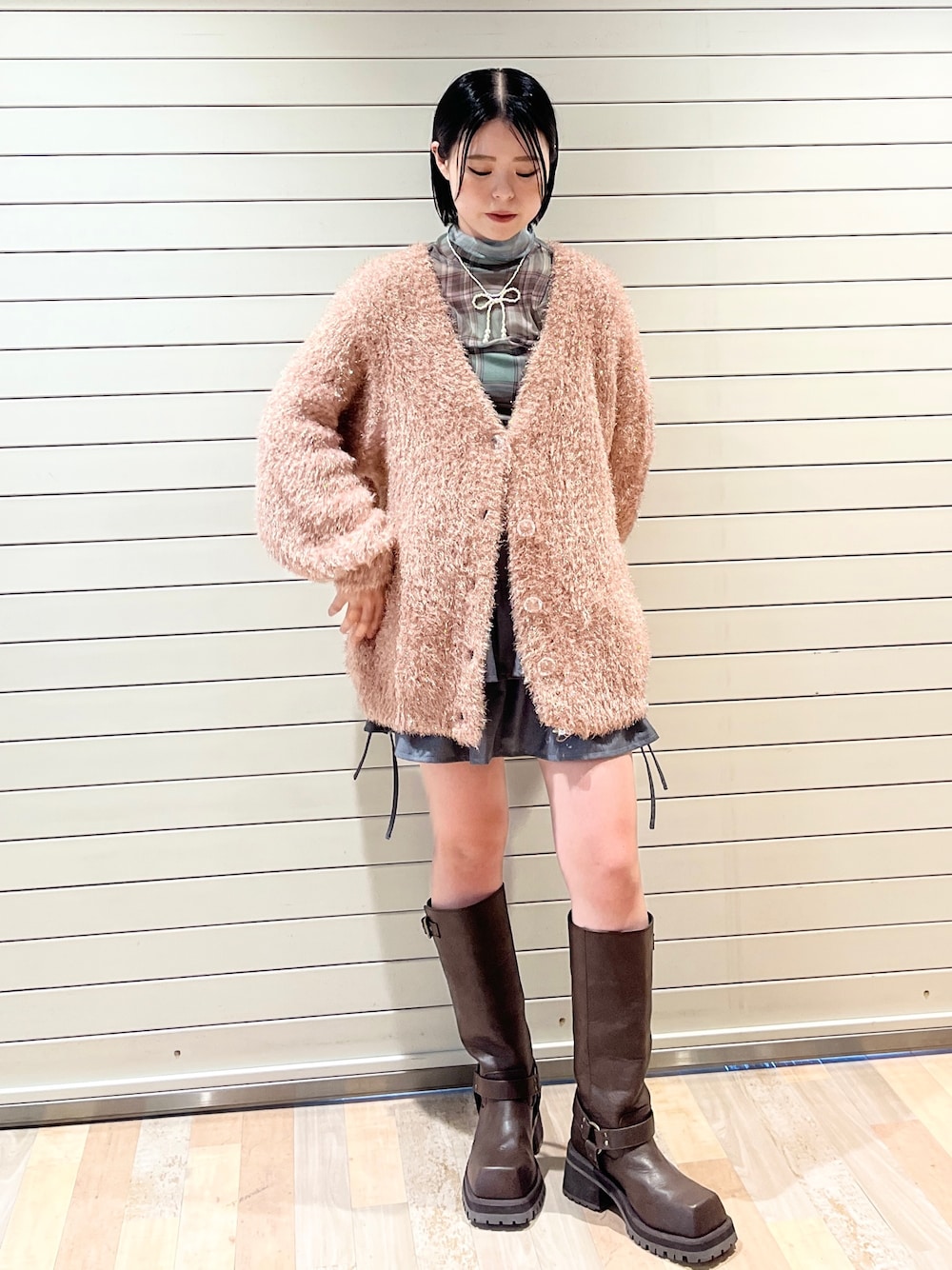 【シアートップス】変形チェックのシアートップスは秋冬大活躍の1枚です⭐︎ タイトすぎないサイズ感で、トップスでもインナーでもヘビロテできます❤︎また、サイドにギャザーを施したデザインなのでウエスト部分が細見えしますよ! 【カーディガン】キラキラのラメが可愛い主役カーディガン♡身長153cmの私でお尻が隠れる丈感です!ボトムスがチラッと見える丈感なので長過ぎる事もなく低身長さんも着て頂けます!また、とっても軽いので秋冬ヘビロテ間違いなしです♡ 【スカート】今季トレンドのバレエコアが叶うリボンティアードスカート❤︎ウエストゴムなのでお腹周りも楽ちんです★また、インナーパンツ付きなので安心して履けます! 【ネックレス】リボン×パールの身に付けるだけで甘めに仕上がるネックレスです❤︎お顔周りもより華やか見えしますよ! 【エンジニアブーツ】今季大注目のエンジニアブーツ★ブーツをONするとグランジ要素プラスされて今年っぽいスタイリングになりますよ❤︎23.5cmでMサイズ着用してます!