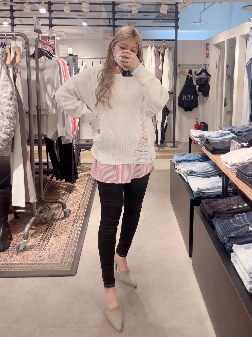 キレイめカジュアルコーデ 【トップス】 ニットは少し透け感があるので、シャツやビスチェの重ね着がかわいいです! ワンピース風やデニム合わせが○ シャツは、薄手なので羽織りとしても着ていただけます! 【シューズ】 ヒール部分が、徐々に太くなっているので安定感抜群○ ニット素材で靴づれしにくいです!