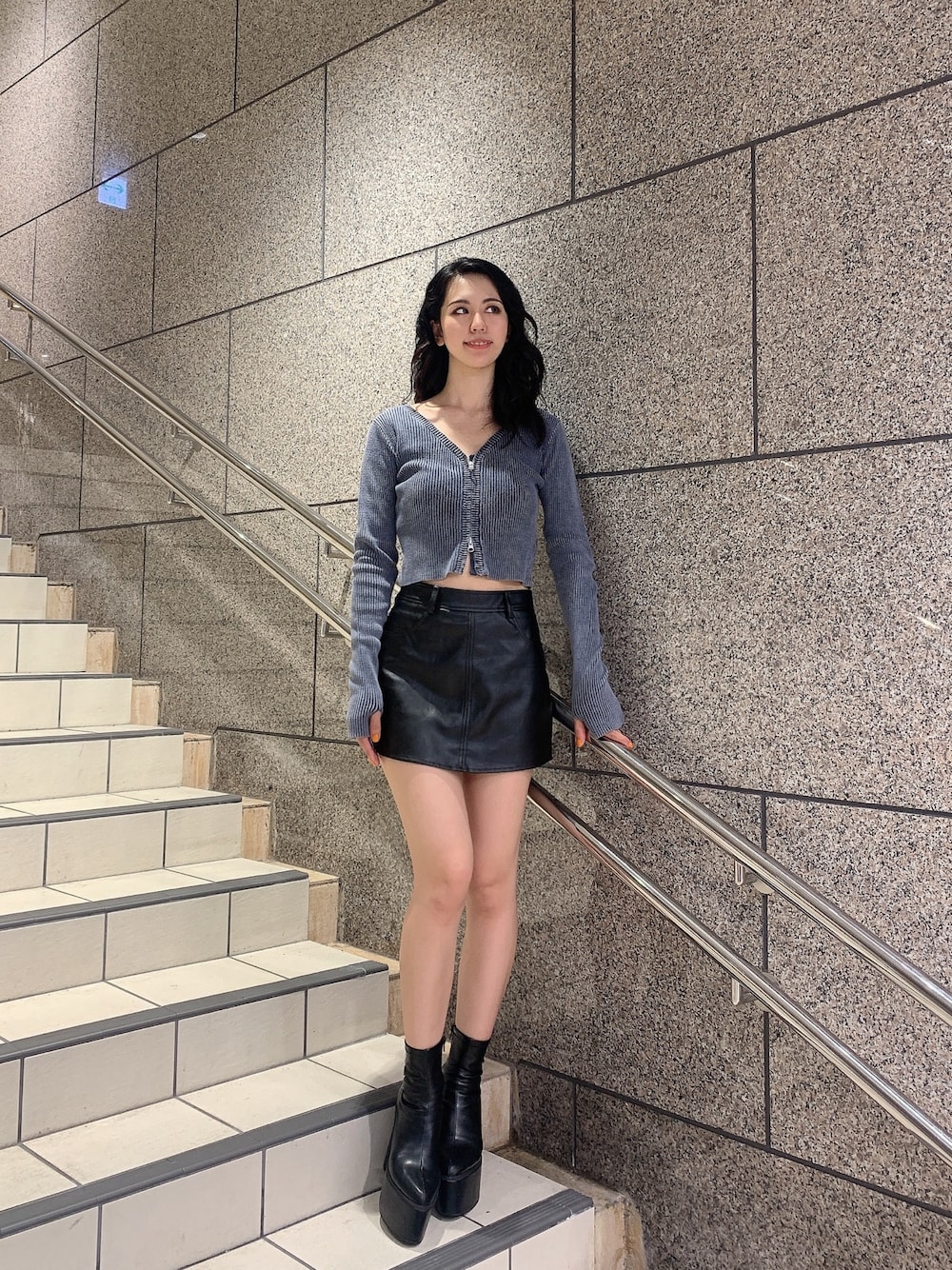 華奢見えコーデ🩵 【トップス】流行りのWファスナータイプのブリーチニットです!中にビスチェを着用すれば羽織としてもお使いいただけます❤️デコルテが綺麗に見える深めのVネックで骨格ウェーブさんにおすすめです! 【ボトムス】店頭でも人気なレザースカート!ラウンド型でより脚が長く見えるようになっています!レザーブーツとの相性抜群です🩷 【シューズ】毎年大人気な厚底ブーツです!今年はヒールが13.5cmと高めに、足首周りがタイトになることで脚が盛れる設計になっています!ストレッチ性があるのでボトムスインもできるのが高ポイント🖤