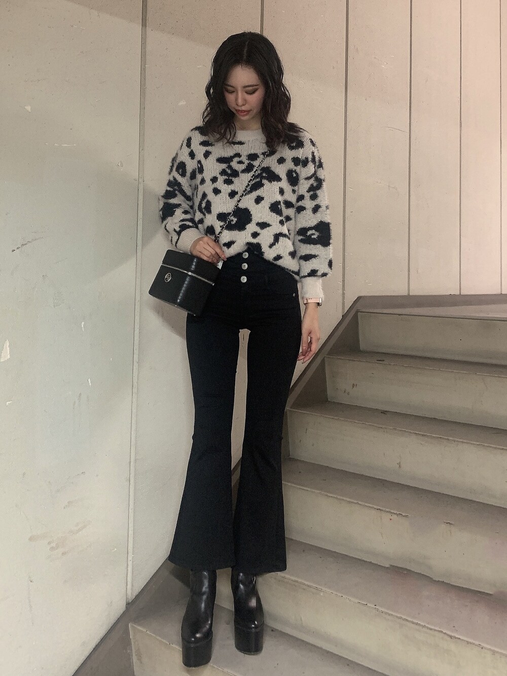 綺麗めカジュアルコーデ 【トップス】シャギーの触り心地抜群なニットです!丈は短すぎずボトムスインしやすいです!170cmでこのような丈感でした! 【ボトムス】美シルエットのフレアでパンツです!ストレッチ性があり普段のサイズのひとつ下がおすすめです✨ 【シューズ】13.5cmのヒールの高さで、前が細めの作りになっているので脚を長く綺麗に見せてくれます!重たい印象になりにくいのでキレイめコーデにもってこいです! 【バッグ】ボックス型のバッグです!ポーチとしてもお使いいただけます!まちありで深いので収納量はなまるです!