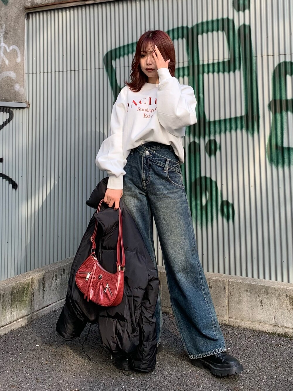 【OUTER】軽くて暖かいダウン🖤 154cmでお尻まで隠れる長さです!! 袖もリブになっているので風を通さず暖かくご着用頂けます🫶🏼 【TOPS】裏起毛のスウェットトップス🍒 腰ぐらいの長さなのでボトムスインもしやすい丈感になっています!! 【DENIM】ウエストデザインが目を引くので腰回りの張りが気になる方でも気にせずご着用頂けます🫶🏼 154cmでも裾を擦らずに着用できました!