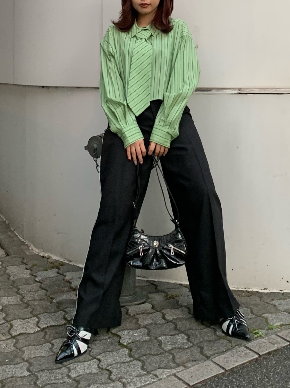 【TOPS】 トレンドのネクタイ付きシャツ👔 丈感短めなので自然とスタイルアップしてくれます❕ ネクタイは取り外し可能なので普通のシャツとしても着用できて着回し力抜群です✨ 【PANTS】 横にサテン生地のラインが入っているので縦ラインが強調されて脚を長く見せてくれます👏🏽 154cmでローヒールのミュールと合わせて裾擦らずに着用できました❕ 【SHOES】 22.5cmでMサイズ着用しています🪄