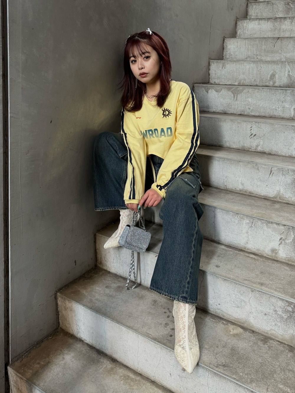 【TOPS】 ウエストのデザインがトレンド感あって可愛いトップス💛 適度な肌見せ具合なので肌見せ苦手な方でも挑戦して頂きやすいです❕ 【DENIM】 ウエストのダメージ具合がかわいいデニム👖 154cmでヒール合わせで裾擦らずに着用できました🫶🏼