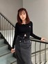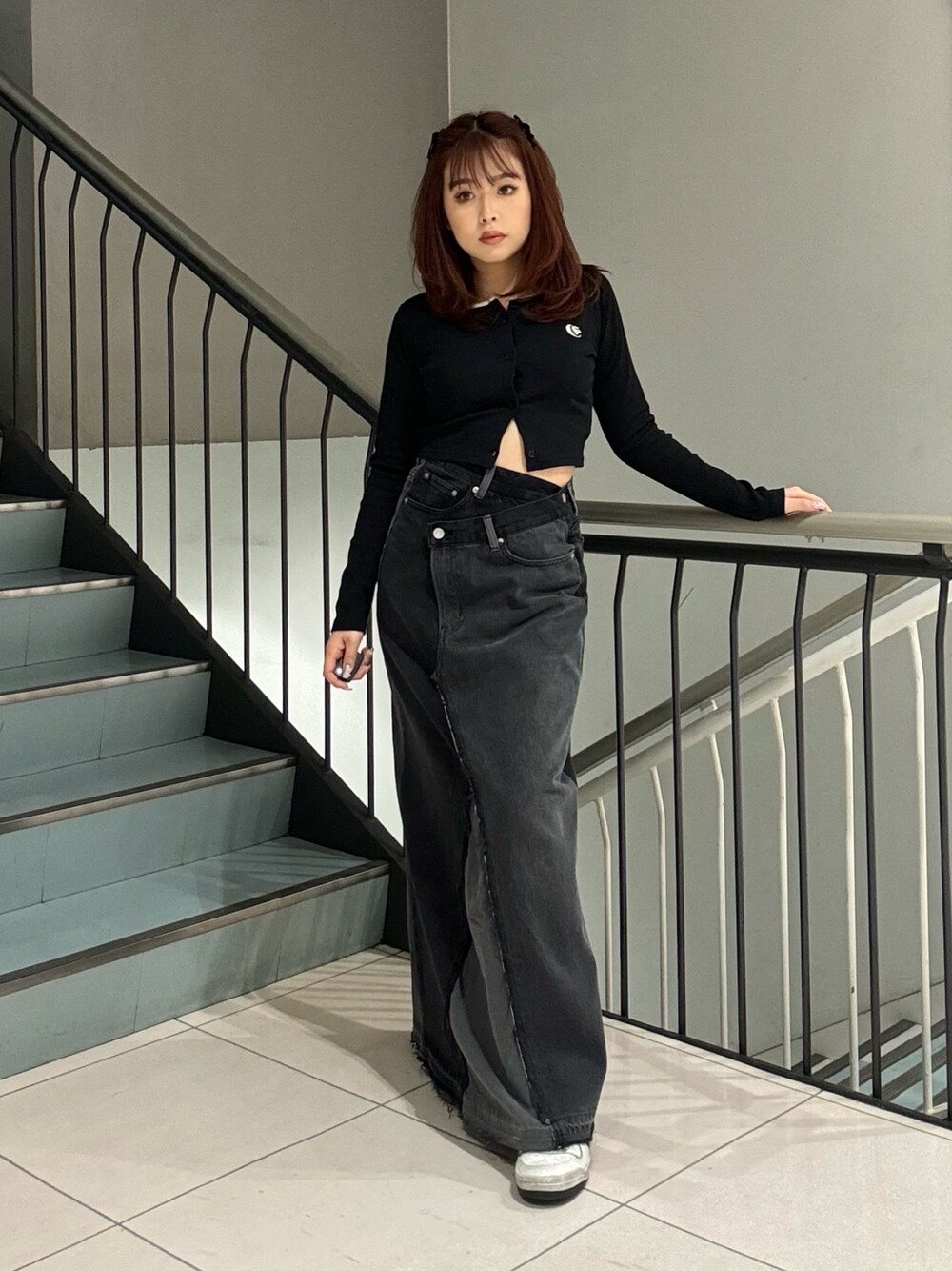 【TOPS】 丈感短めなので自然とスタイルアップして見せてくれる優秀トップス👏🏽 フロントボタンは自由に開閉可能なのでお好みで肌見せすることもできます❤︎ 【SKIRT】 トレンドのズルっと着られる丈感長めのデニムスカート👖 154cmでもスニーカー合わせで裾擦らずに着用できました❕