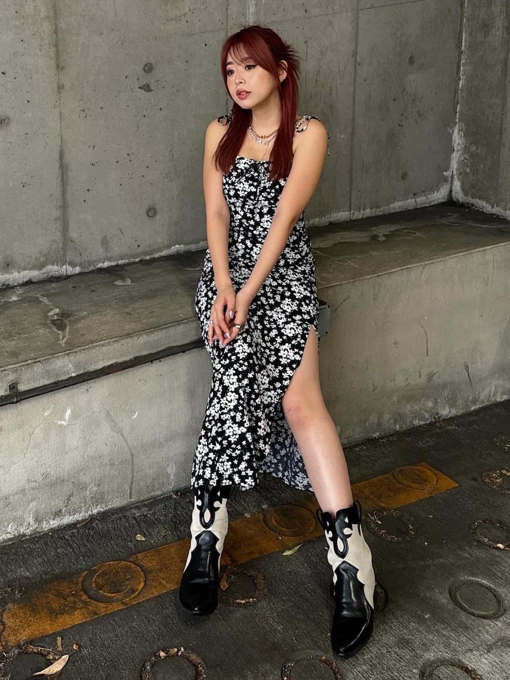 藤岡真央(EVRIS)のワンピース「フラワーキャミワンピース」を使ったコーディネート