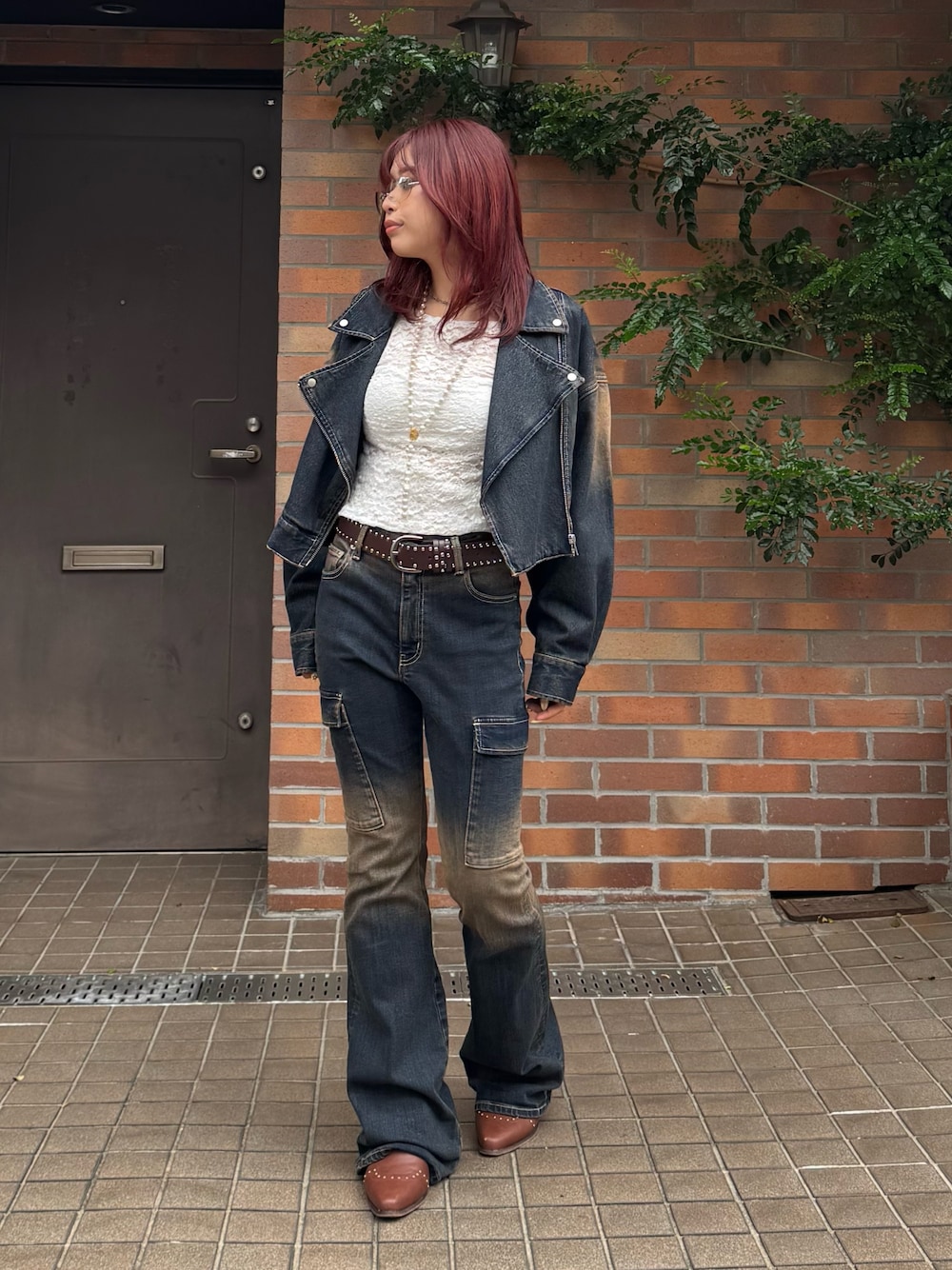 【TOPS】 レース素材のバックオープントップス🪽 伸縮性のあるレースなので着心地も良いです! 【JACKET】 154cmで腰にかかるくらいの長さで着用できました! 柔らかいデニム素材と袖幅しっかり太めなシルエットなので分厚いインナーも着込みやすくなっております🫶🏼 【DENIM】 154cmローヒール合わせで裾ギリギリ擦るか擦らないかぐらいの長さで着用できました!