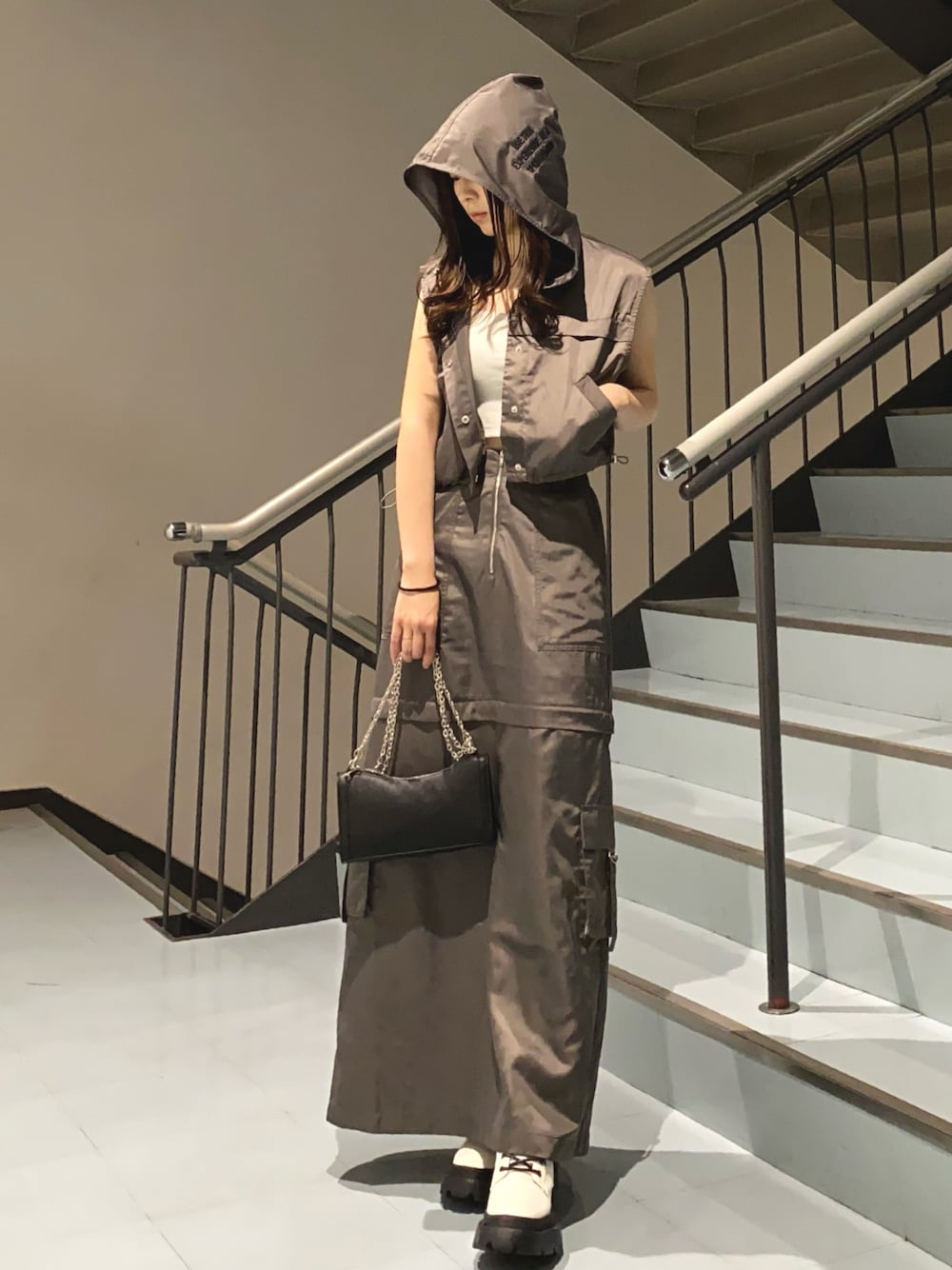 林瑞季(EVRIS)のベスト「フードドロストショートベスト【セットアップ着用可能】」を使ったコーディネート