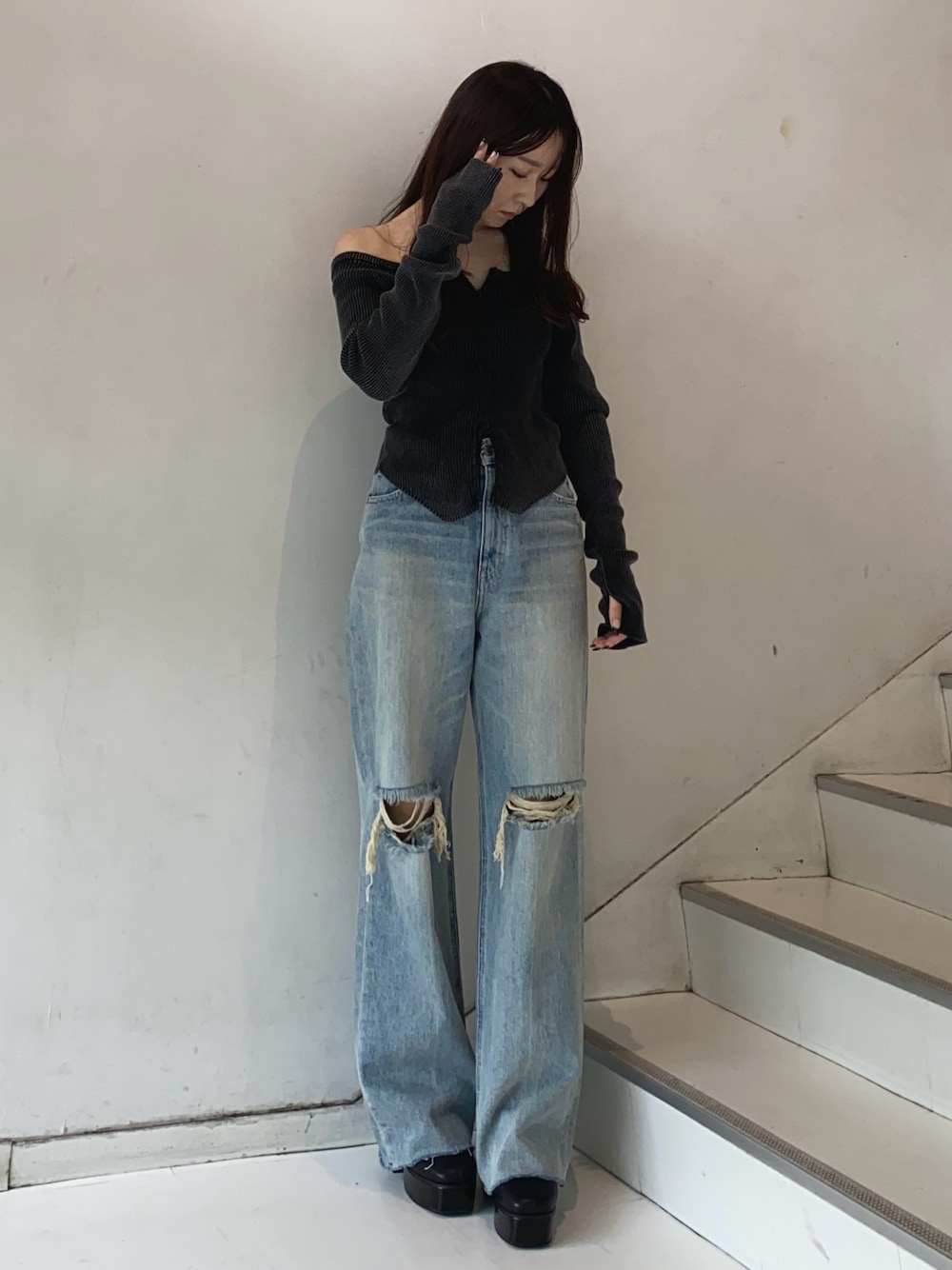 【tops】オフショルでもオフショルじゃなくてもどちらでも着用可能なトップスです!指抜きになっているので腕が長く見えます♡ 【denim】159cmでSサイズ履いてます! ダメージの位置が膝より少し高めの位置が開いてるので膝下が長く見えて脚長効果抜群です⭐︎ 【shoes】24cmでMサイズ履いてます! 中のクッションがしっかりしているので厚底ですが、長時間履いても疲れません!