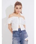 【tops】ダブルジップになっているオフショルトップスです!ウエストラインが綺麗に見えます! 【denim】159cmでSサイズ着用。特徴的な加工とダメージ感が夏っぽく可愛い🌞 【shoes】24cmでMサイズ着用。スタッズデザインが可愛く、スウェード素材のサンダルなので冬以外のシーズンで履いていただけます!