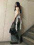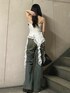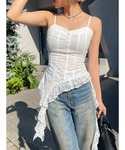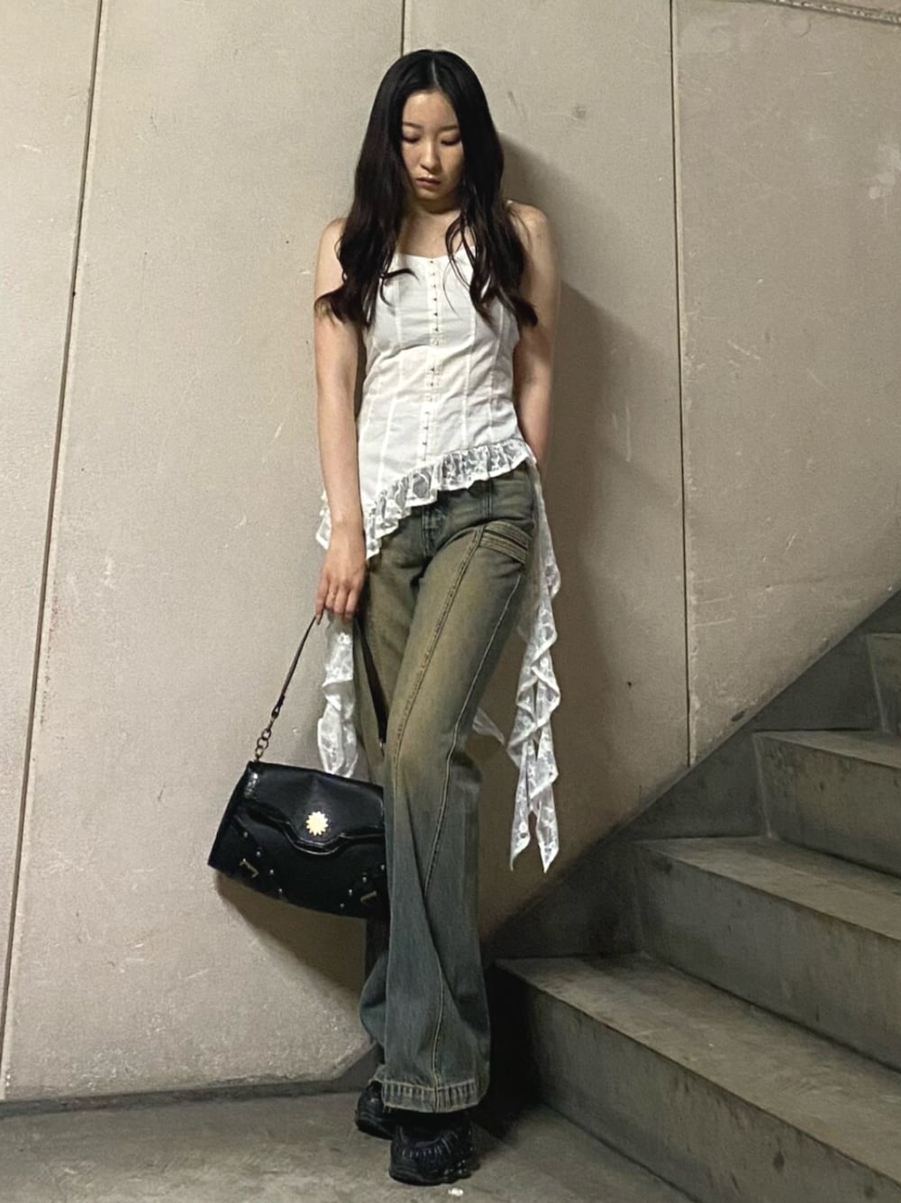 【tops】裾のひらひらがレースなのが他と差が付くポイント!後ろのゴム部分がしっかりしてるので1枚で着ても胸元パカパカしません! 【denim】159cmでSサイズ着用。セミフレアのデニムパンツです!ヴィンテージ加工が可愛い! 【bag】内容量抜群なバッグです!形と素材感がY2K感満載です☺︎