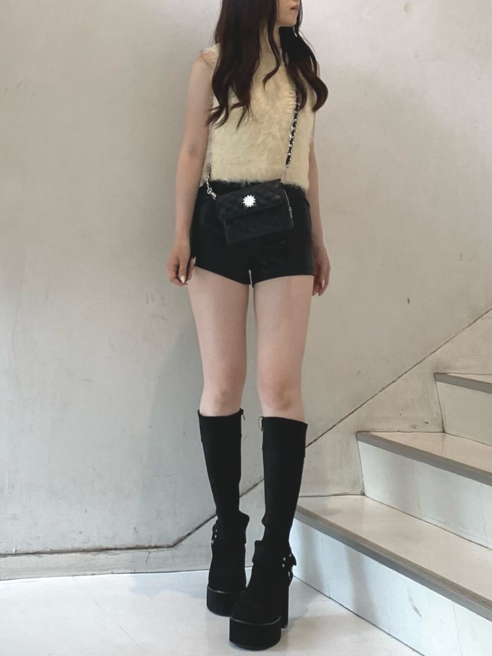 【tops】ファーが可愛いトップスです!首元もチクチク感なく着用できるので、もけもけトップス苦手な方でも着れちゃいます🙆♀️ 【pants】159cmでSサイズ着用。少しコンパクトな形のレザーパンツです!1枚でも着ていただけますし、トレーナーなどのインナーにも着用しやすくなりました。 【shoes】24cmでLサイズ着用。ストレッチ性がとにかくあるロングブーツです!ふくらはぎの部分の生地が柔らかいのでキャリーケースに入れても場所とりません! 【bag】ウォレットチェーンで、口が広く開くので中が見やすいのが個人的嬉しいポイントです!