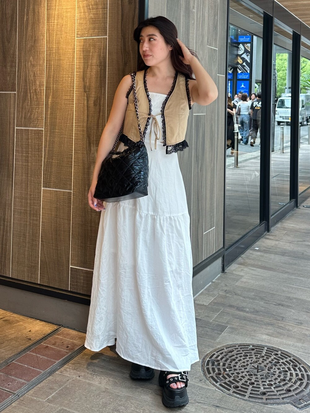 【夏のワンピースコーデ♡】 《tops》トレンドのレースベストで生地感も柔らかいので夏でもさらっと着用できます! 《bag》まちがしっかりとありペットボトルもはいるぐらいの大きさで大容量はいります。 《one-piece》ウエストが空いているので細見えし生地感も柔らかくて着心地いいワンピースです 《shoes》傾斜の高さが一定なので足が疲れずに歩けて軽いスポサンです♥ 23cmでSサイズ着用。