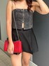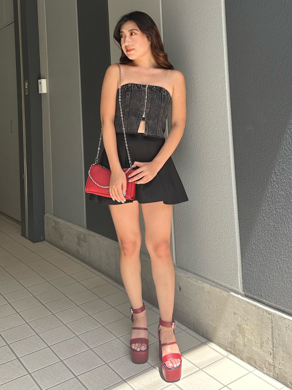 【デニムコレクションコーデ♡】 《tops》タイトなデザインでデコルテも綺麗に見えて細見えします!生地感はしっかりとしていて少しかためです。 《skirt》いつもよりもミニ丈のスカートで152cmでもすっきり着用できウエストのデザインもかわいくてオススメのスカートです♡ 《bag》手持ちでも肩掛けもできてトレンドのREDの色がかわい✨ 《sandal》傾斜の高さが一定なので足が疲れずに歩けて軽いサンダルです! 23cmでSサイズ着用。