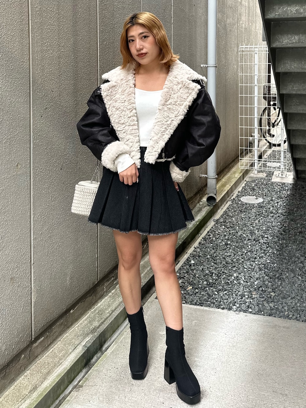 【冬のアウターコーデ♡】 tops→生地感もしっかりしていて透けにくいトップスでデコルテが綺麗に見えます! outer→去年よりも軽くてファーの素材がふわふわで柔らかく、丈もショート丈なので153cmでも割とすっきりと着用可能です! skirt→ 形がきれいなデニムのプリーツスカートで生地感も柔らかくて履きやすいです。153cmでSサイズ着用。 bag→ コンパクトなサイズ感でまちもある為しっかりといれていただけます!ニットの生地がかわいい♥ boots→ 足首まわりが細身なので足がきれいにみえてスッキリと着用できます!!153cmの足23cmでSサイズ。