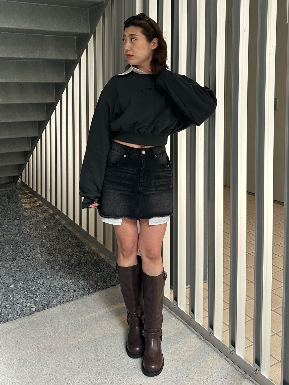 tops→胸元にワンポイントのデザインがはいっているのがかわいくてクロップド丈なのでウエストが細見えします! shirt→こちらもクロップド丈なのでレイヤーもしやすくて、春は1枚で着用してもかわいい♡ skirt→ 中にインナーパンツもはいっていてポケットがみえるデザインがおしゃれでかわいい♥Sサイズ着用。 boots→ 足が細見えして長く見えるロングブーツ!すこしカジュアルっぽくみえるバックルもかわいいです!153cmで足23cmでSサイズ着用。