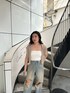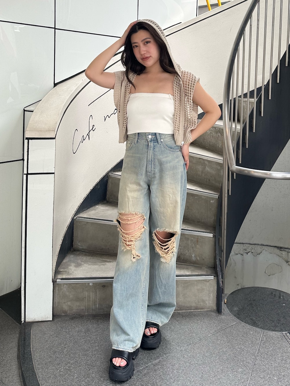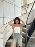 tops→メッシュのデザインがかわいくて柔らかい生地で夏さらっと着用できます! denim→ 生地感が柔らかくてダメージ加工の色味がかわいい♥夏でもさらっと着用できます! Sサイズ着用。 shoes→ 高さが一定な為足も疲れずに履いていただき、クッション性もあるので歩きやすいです!23cmSサイズ着用。
