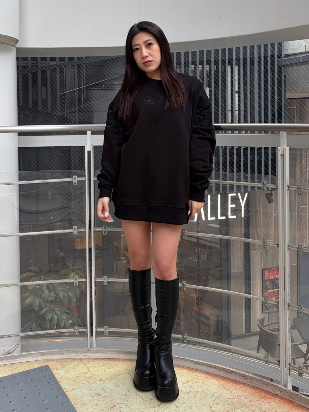 tops→しっかりとしたスウェット生地に、袖部分をレースで切り替えた異素材ミックスデザイン。そこがおしゃれでかわいい♡ワンピース丈で着用⭕️ boots→ 履くだけで盛れブーツといわれていてすごく軽く傾斜の高さもあまりないため疲れにくいブーツです!!23cmSサイズ着用。