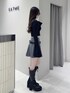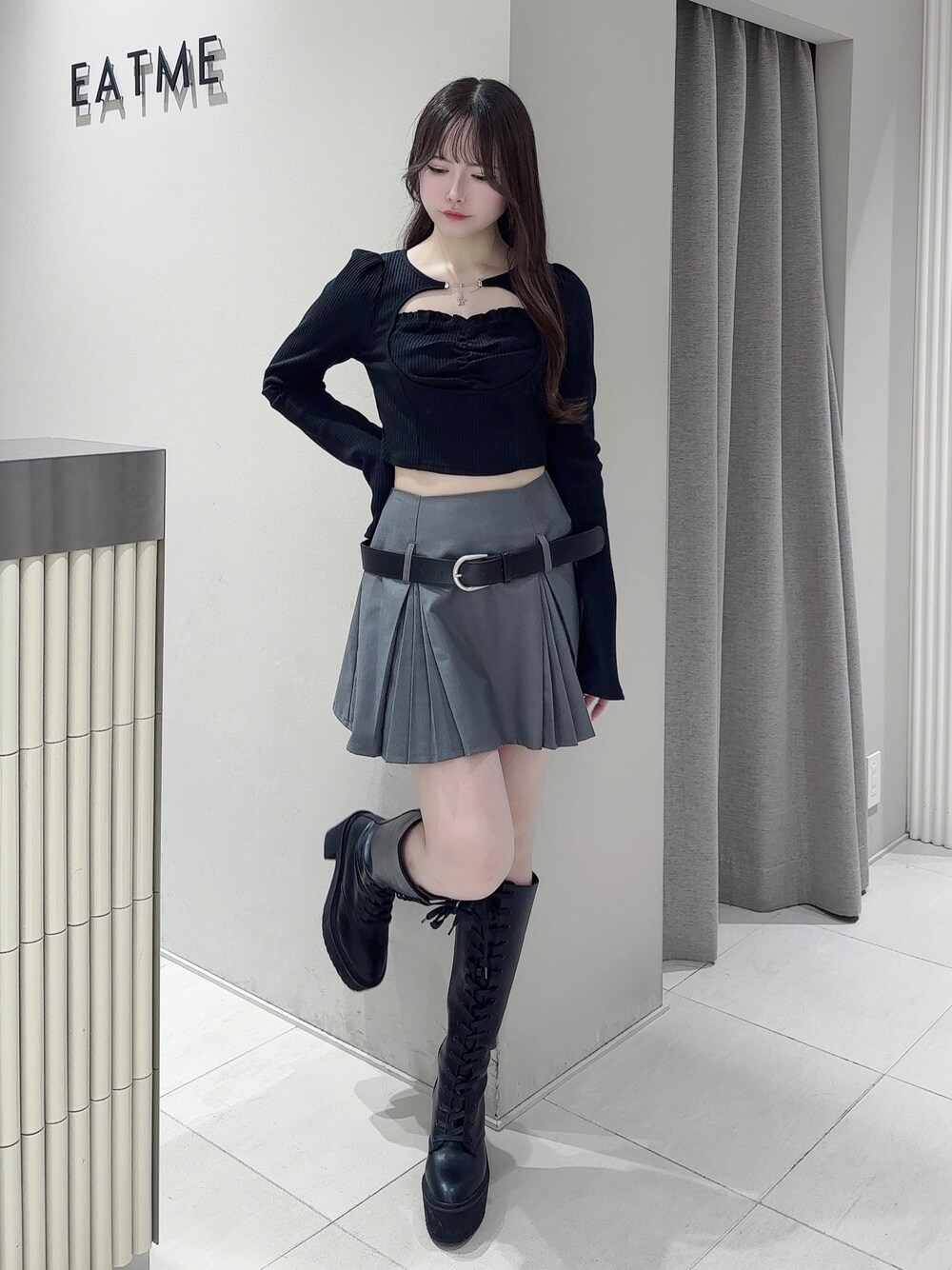【トップス】 大人可愛いリブトップス🤍ハートカットとお袖のフレアデザインが女性らしい印象に❤︎デコルテにチャームが着いているのでアクセサリーいらずなのも楽チンで嬉しい🥺 【スカート】 細プリーツの付いたミニスカート✨️ ローウエストのベルトが付いていてトレンド感のあるデザインです❤︎インナーパンツが付いているのも嬉しいポイント🥺 【シューズ】 レースアップロングブーツ🖤前も高さがあり高低差が少ないので歩きやすいです✨️コーデに合わせるだけでトレンド感ののあるスタイルになります❤︎私は24.5cmでLサイズを着用しています!