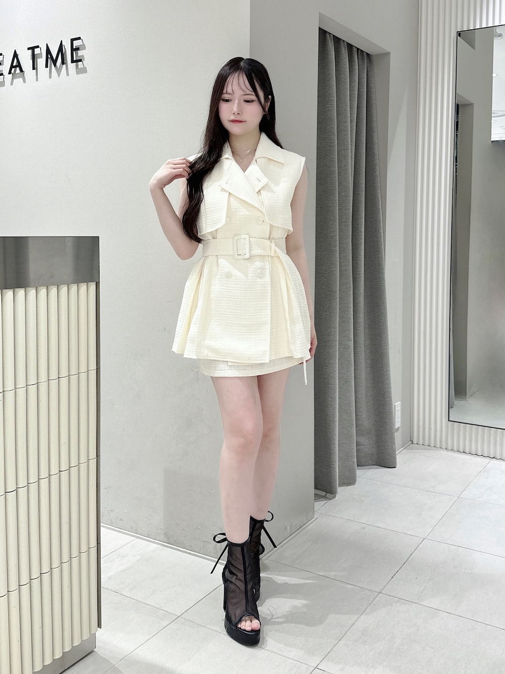 【ワンピース】 ベルト付きベストとスカートがセットになった着回し力抜群アイテム✨️ツイードで厚めの素材ですが、ベルトでウエストマークできるのでスタイルアップできます◎デートや女子会にオススメ🤍 【シューズ】 シースルーデザインのブーツサンダル✨️メッシュ素材なので春から夏まで着用できます◎バックリボンがポイントでカジュアルすぎず綺麗めな印象になります🎀24.5cmでLサイズを着用しております!