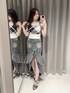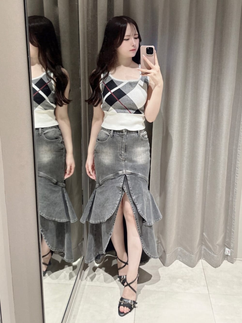 【トップス】 ニットトップス🤍大きめのチェック柄がガーリーな雰囲気になります❤︎秋先取りできるデザインです🍁🍂カップ付きで1枚で着られるのも嬉しいポイント❕ 【スカート】 マーメイドデニムスカート✨腰周りはフィットしたシルエットで膝からフレアが広がっているのでメリハリが出るデザイン◎カジュアルすぎない雰囲気なのでデニム初心者にもオススメ✨ 【シューズ】 チェーンデザインのサンダル✨️オリジナルチャームも付いているのもポイント❤︎細めのヒールと華奢なベルトが上品✨️24.5cmでLサイズを着用しています!