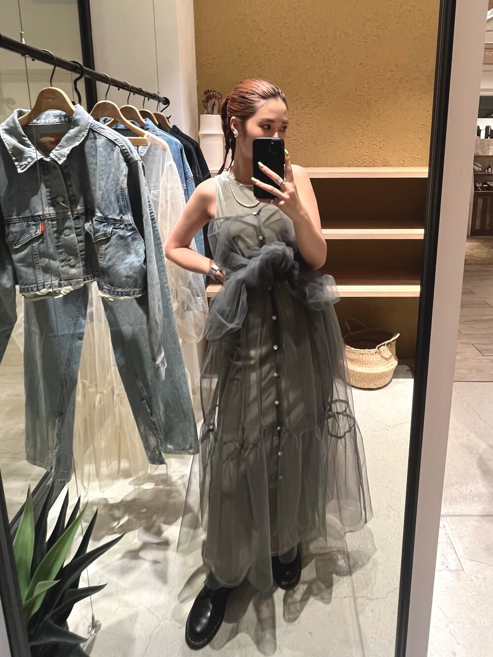 お呼ばれコーデ🩶🩶 ベロアワンピースとチュールワンピース合わせるとより綺麗めになるので、結婚式の二次会などにも使えます! デニムジャケット✖️ベロアワンピースなど、カジュアルなアイテムとの合わせも可愛いです😍