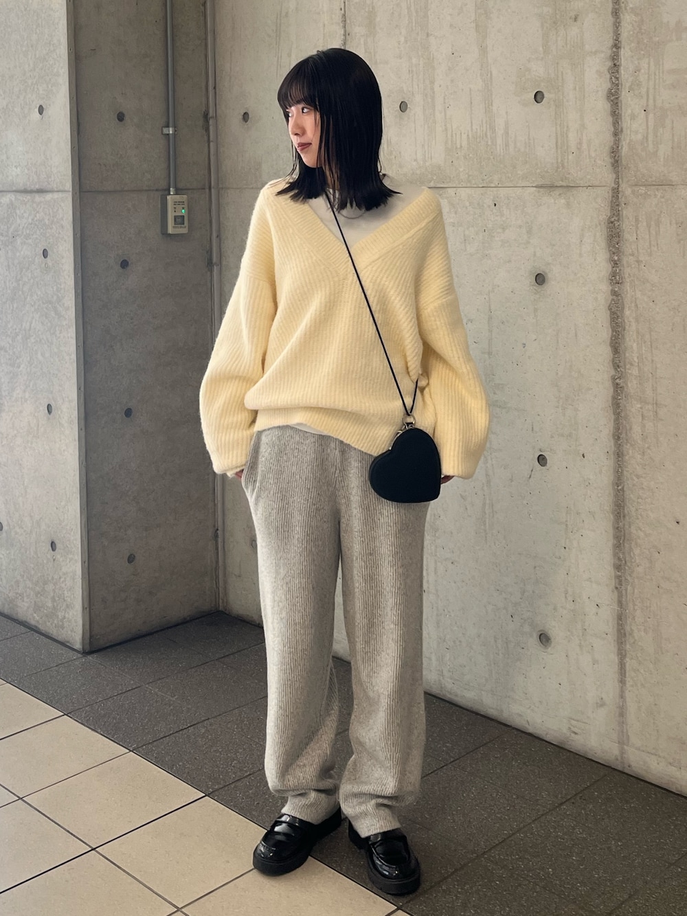 【ニット】 可愛くもちっとした生地感でチクチクなく、ゆるっとラフに着れるニットです! Vネックなので、インナー次第でスッキリ着ていただけます! 細めのデニムやスカートと合わせる、綺麗めなスタイリングも可愛いです! 【パンツ】 昨年大人気だったニットパンツ! ウエストがゴムでゆるっとラフに履けます! 丈長めですが、厚底のブーツなどで合わせていただくと低身長さんでも履いていただけます! 【バッグ】 シンプルなコーデに合わせるだけでハートがアクセントとなり、一気に可愛く見せてくれます❤️
