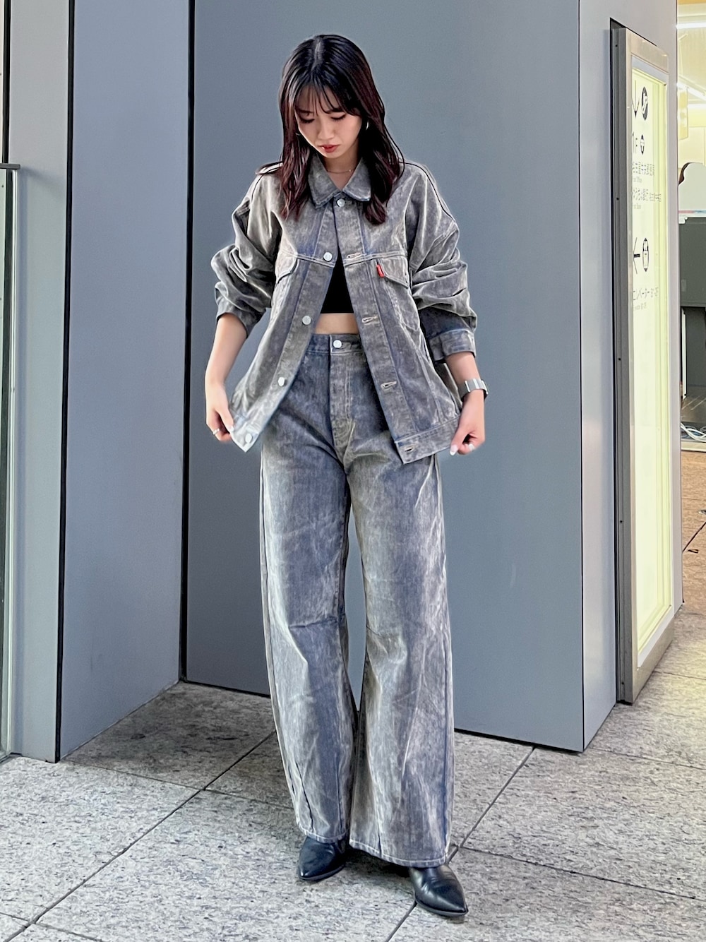 【デニムジャケット】 フロッキー加工で起毛感のある素材です! 素材感と色味が他になくて、ジャケット羽織るだけでおしゃれ&高見えします! ungridの定番のデニムジャケットよりはサイズ感が小さいため、低身長さんでもバランスとりやすいと思います! 【パンツ】 デニムジャケットと同じ素材感です! 164㎝で24inch着用しており、3センチくらいのヒールでちょうど良い丈感です! ウエストはフィット感あり、ヒップ周りはゆったりめなので、ウェーブ体型の方でも綺麗に見えるシルエットです!