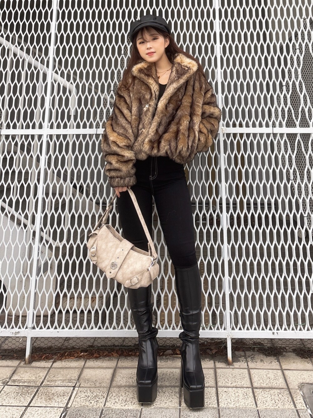 【OUTER】 トレンドのファーショートコート です! ミンク風のフェイクファーを使用しており高級感溢れるデザイン ✨ ショート丈なので色んなコーデに使っていただけます ! 【DENIM】定番のワンウォッシュスキニー★ 伸縮性のかなりあるボトムで楽に履いていただけます。GYDAらしい白のステッチデザインが細見え効果があるのでオススメです! 【SHOES】 毎年定番のストレッチレザーを使用したチャンキーヒールのブーツです! 膝下くらいの丈感で足だしコーデにも使っていただきやすいですし、前後の高低差が無いので安定して歩いていただけます♥ 普段の22.5~23.0の私はSサイズでピッタリでした! 【BAG】 オリジナルのロゴプレートをあしらったベルトデザインがポイントのバッグ ♡ 加工したように見えるプリントのフェイクレザーを使用してます! キャスケットは 被るだけでオシャレに見えます ♡ お揃いのBAGも発売してるので 一緒に持っても可愛いです!