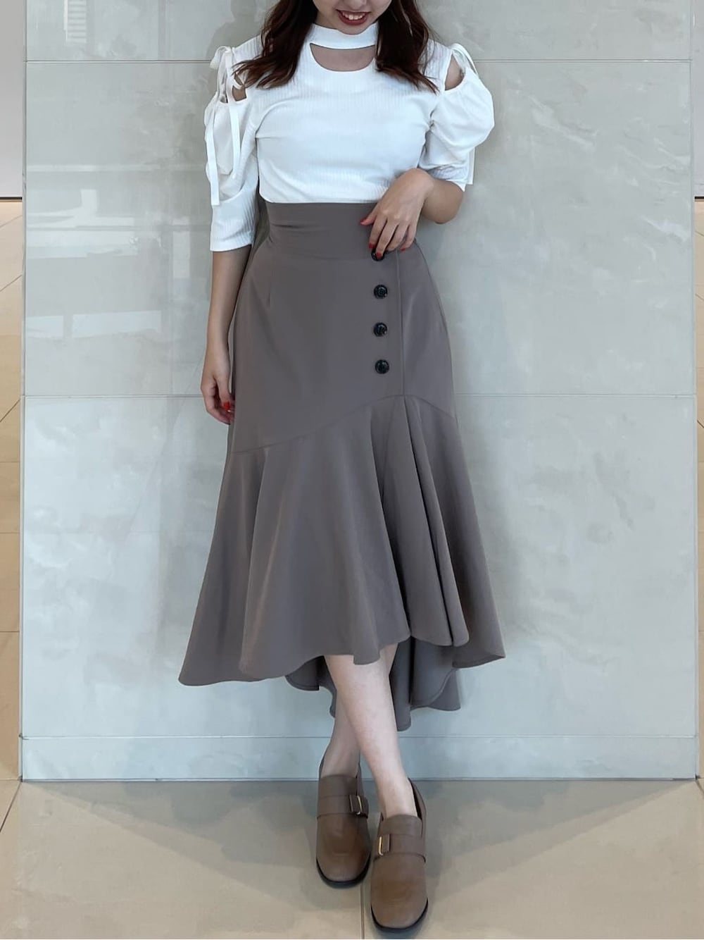 着回し万能アイテムコーデ♡【トップス】袖元のリボンを外すとオープンショルダーになり2WAY見せが可能、さらに前後どちらでも着ていただけます◎雰囲気が二重で変えられるので着回しの幅が広がる1枚です!【スカート】薄手だけれどしっかり目の生地で、滑らかな素材感なのでとっても上品に♡イレヘムマーメイドシルエットがスタイルアップを叶えてくれます!お尻の大きな私でも気にせず履けました!【シューズ】秋の定番アイテム!どんなスタイリングにも合わせやすい1足です!私はパンプスやブーツだと足が痛くなりやすいので安定感があり履きやすいローファーは毎年必ず履いてます♡(私の普段のシューズサイズはSかMサイズですがサンプルの為、Lサイズを着用しております。)