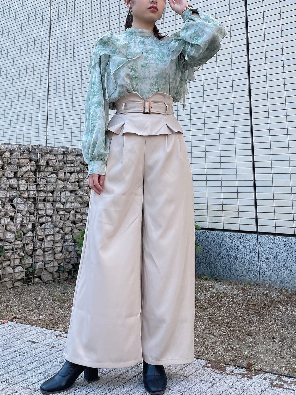 フリル×パンツで大人コーデ♡【トップス】夏に大人気だったブラウスの秋冬バージョン!色味も秋冬仕様なバリエーションになっております♡BGEのカラーはハリのある生地感ですが、GRNとPPLは素材感が柔らかく肌あたりも肌触りも良い♡そしてフリルと後ろのリボンもとっても可愛いです!⸜❤︎⸝【パンツ】ウエストがペプラム仕様になっているので少し普段とは違うパンツが履いてみたい方にもオススメ♡こちらのパンツは下半身が大きい私でもSサイズでちょうど良かったです!画像のような甘めのトップスとの組み合わせも可愛いですし、シンプルめのトップスにして頂くと綺麗めな印象に変身します♡【シューズ】ストレッチが効いていてとても履きやすい◎ヒールも高すぎず安定感があり歩きやすいので程よく身長を盛りたい方にオススメです!