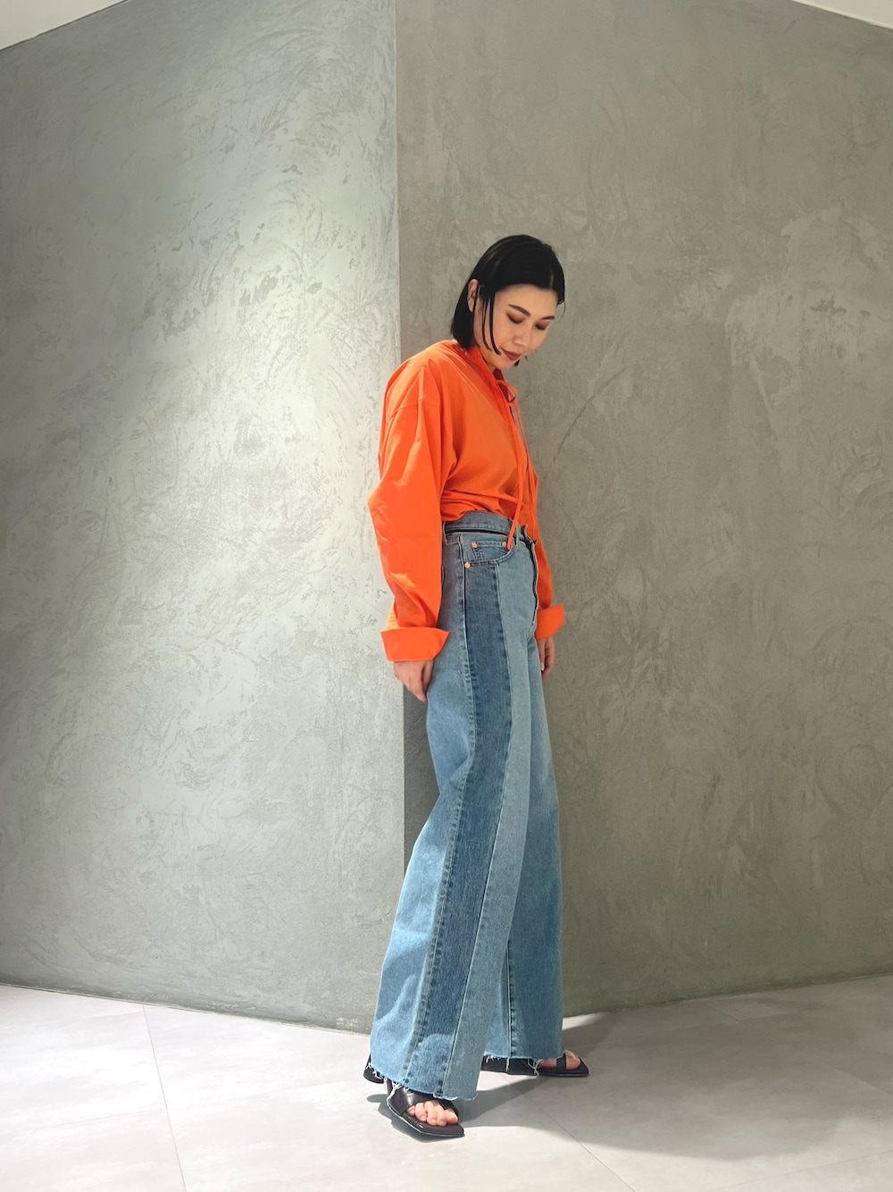 前後両方着られる2wayブラウス! 袖のボリュームも可愛く、着回し抜群です! シワになりにくい素材で取り扱いもしやすいですよ⭕️ これからの季節、気温も上がってきたときに羽織として持っていても重宝します🌷 デニムはハイウエストで腰位置が高く、ヒップが上がってみえます! 最後のリメイクラインがスッキリ見せてウエストラインにもリメイクされているので綺麗に見えるこだわりがたっぷり詰まったデニムです! サンダルは安定感あって、スクエアの足先が綺麗に見えるシルエットです!