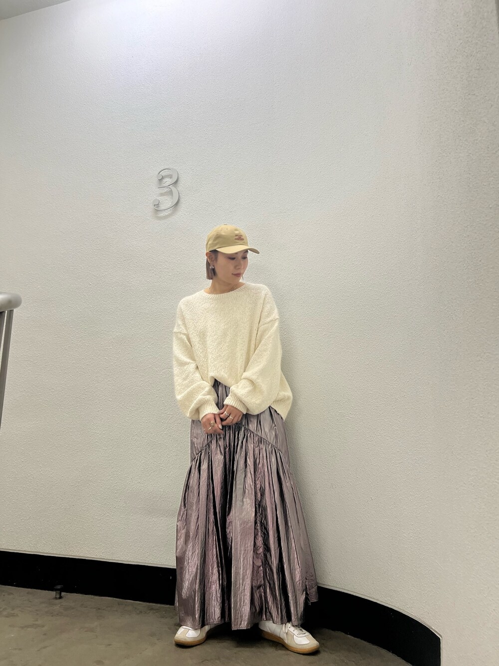 ニット:綿100%で肌触りが柔らかいニットです! ゆるっとしたシルエットでラフに着られるのでつい着たくなるニットです♡ スカート:キラキラで光沢感が目を引くスカート! ギャザースカートの特徴の腰回りがすっきり見えて斜めのギャザーデザインが動きがかわいくでます! 軽くてすごく履きやすいですよ♡ キャップ:カラーと刺繍ロゴの配色がどれも可愛いですよ♡ コーデのアクセントにぜひ!