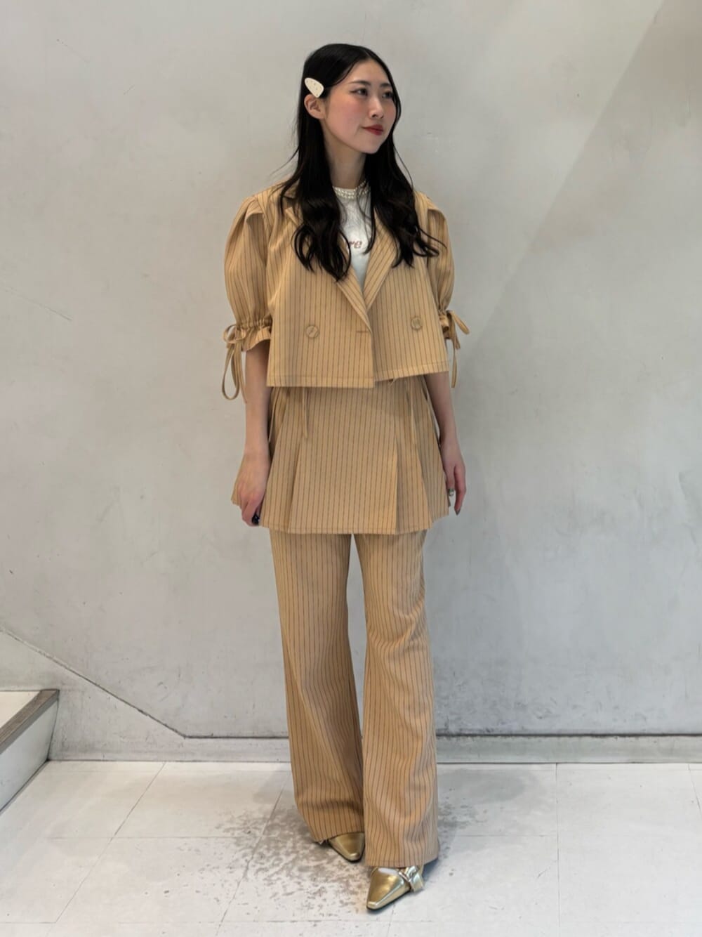 【ジャケット】 鎮西すずかちゃんコラボアイテム♡ ショート丈の春夏ジャケット♡ 身幅はゆとりがあるタイプでボタンを開けて着ると前から見たシルエットが綺麗で可愛い♡ 【スカート】 プリーツスカートはミニ丈なので足長効果もあります!スカート一枚で着る時はインナーがあると便利です♡ 【パンツ】 こちらも美シルエット♡ 少しだけフレアなシルエットになってて足が綺麗に見えます!生地感もさらっとしてて着心地もいいです♡ 156cmでヒール履くともたつきません。 【パンプス】 ハトメベルトのパンプス♡ 23.5cmでMサイズ着用。サイズはぴったりです! かかと部分の紐がゴムなのでかかとに引っかけるだけで着脱簡単♡ 軽くて歩きやすいです♡