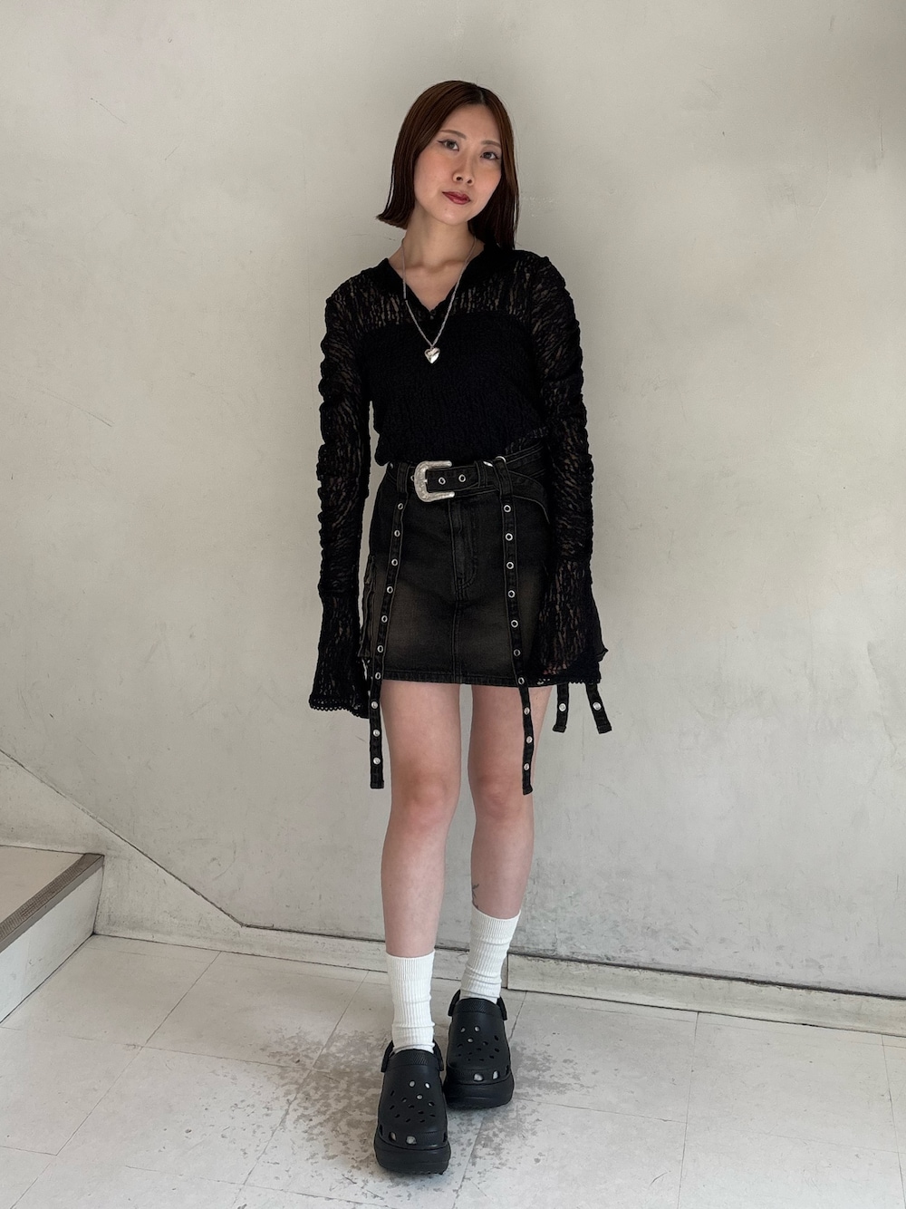 【トップス】 レーストップスはぴためな着用感で細見え間違いなしなアイテムです!伸縮性はあるので着やすいです! レースにフードが付いてるのも珍しいのでカッコよく着られます! 【スカート】 飾りが可愛いデニムスカート!ベルト付きです! インナーパンツが付いてるので安心です! 156cmSサイズ着用してます!ミニ丈ですがショーパン感覚で履いて頂けます! 【靴】 今流行りのクロックスです! 自分のサイズが23.5cmで23cm着用してます。 少しぴったりめな着用感ですがサイズは良さそうです。