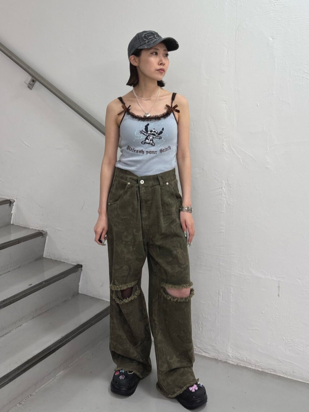 【キャミソール】 スティッチコラボのアイテム! パット付きで凄く安心、そして伸縮性もバッチリなので着やすいです。 生地もピタッとしてくれるので1枚で着れそうです〇 【パンツ】 デザイン柄が可愛いパンツ! フリーサイズで少しウエストは大きめ。腰で履く様につくられてるのでウエストで履く場合はループに金具を引っ掛けて調節して履いてます! 156cmでウエストで履いても少し長めなのでダボッと着たい方はおすすめです。