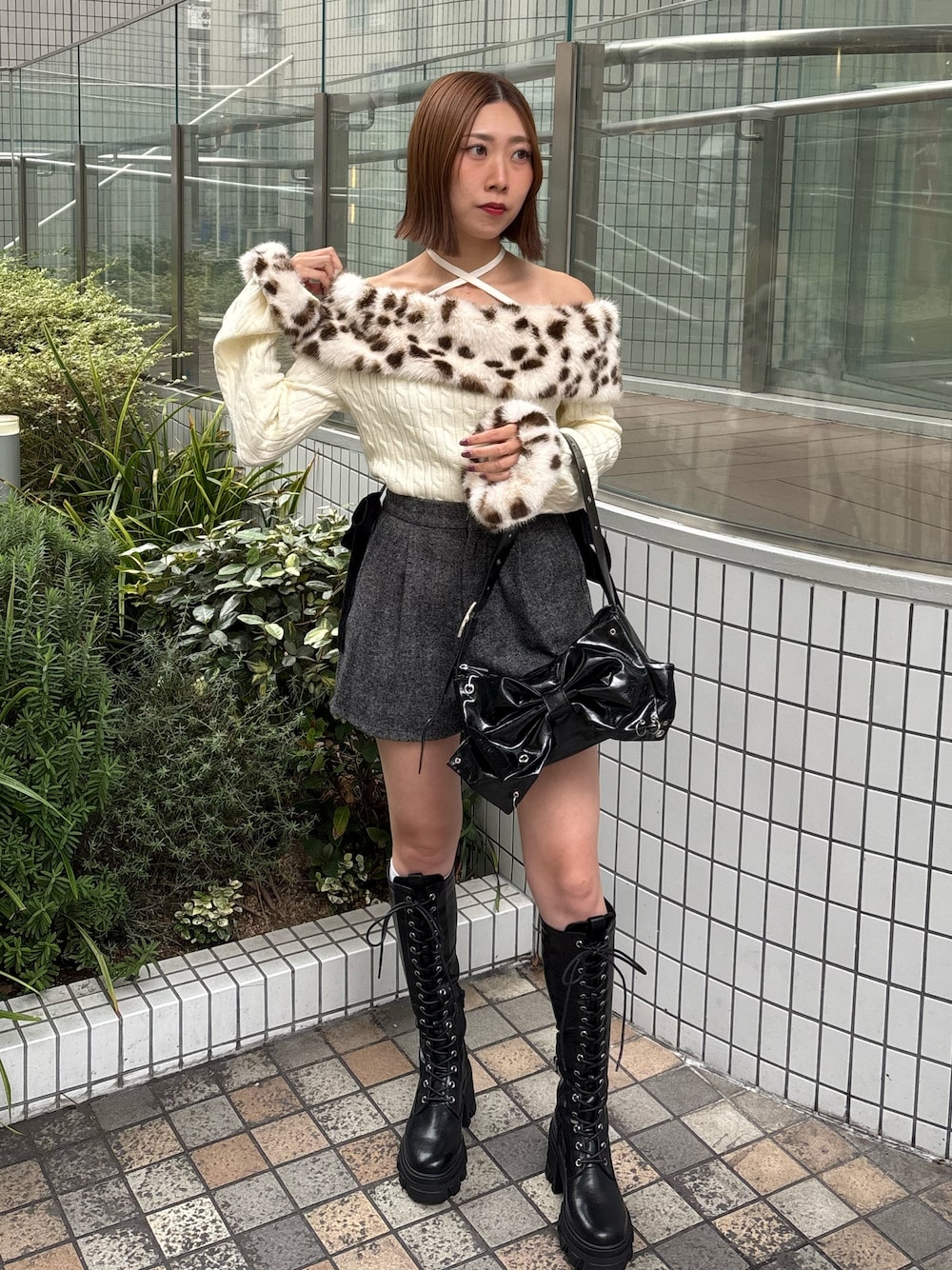【ニット】 ヒョウ柄が可愛いオフショルニット。 ファーは取り外し可能です。 156cmでボトムインできる丈感。生地感も厚めで温かいです。 【ボトム】 セットアップ対応のショートパンツです。 156cmで長すぎず安心感のある丈感。 サイドのリボンは取り外し可能です。 【ブーツ】 大人気のレースアップブーツ! 23.5cmでMサイズ着用。 ふくらはぎが伸縮性もあり、フィットしてくれるのでこちらも足細効果あります! 伸びるので歩きやすくてぜひ試してみて欲しいです!