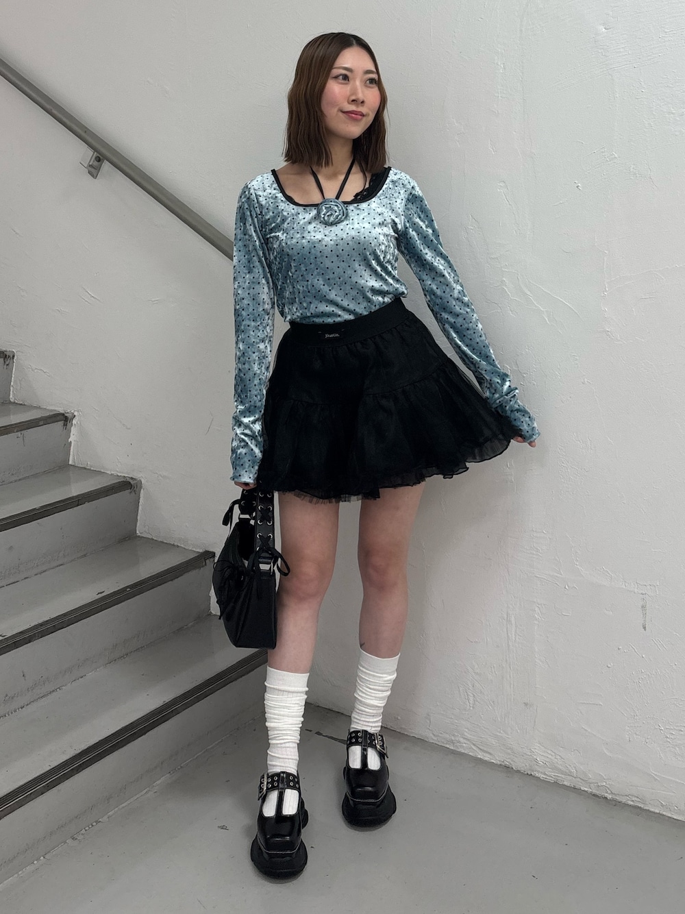 【トップス】 ドットのベロア生地が可愛いトップス。 バラのコサージュは取り外し可能です。 デコルテが空いてる分華奢みえします。 156cmで腰上の丈感。 【スカート】 ボリューミーなスカート! インナーパンツが付いてるので安心♥ そしてシルエットが可愛すぎる! 透け感あるけど透けない感じで足長効果も抜群! 【シューズ】 レースアップの厚底シューズ! 23.5cmMサイズ着用でフィット感あります。靴底柔らかく歩きやすいです。