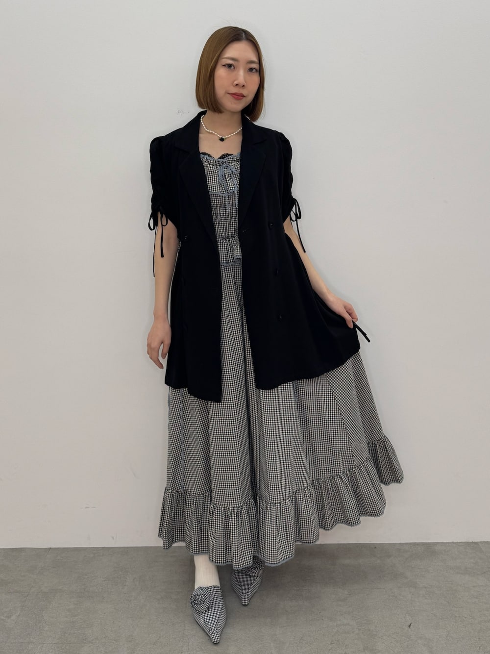 【ワンピース】 大人っぽい夏ワンピース! ギンガムチェックが甘すぎないシルエットです。 トップス部分がゴムなので楽ちんで涼しいです。156cmでくるぶし少し上くらいの丈感です。 【アウター】 きれいめ夏用ジャケットです! 前を閉めるとワンピースにもなるので色んな着回しができます。 サイドのカットがあるので1枚でも夏涼しく着れます。156cmで膝上です。 【シューズ】 バラのモチーフがついたパンプス! 生地感は柔らかいので履きやすいです。23.5cmでMサイズ着用。ぴったりです。