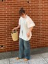 《ブラウス》 ボタンを開けて羽織としてもお使い頂ける万能ブラウス🎀 前後どちらでも使える2wayタイプです✌︎ とても柔らかい生地感で着心地◎ 袖の部分はゴムになっているので、ボリューム間出しても可愛いです🥰 お尻も隠れる丈感なので、腰回りやお尻をカバーしたい方にもおすすめ!透け感があるのでインせずに出したままでもこなれ感が出せます✨ 《デニム》 大人気のハイウエストルーズストレートデニム👖 25inch着用してます!(5cmのヒール着用) 丈感をあえて長く作っているので、裾の部分をクシュっと履いていただくのが、おすすめです🙆🏻♀️ 太もものハリが気になる私ですが、このデニムは太ももから同じ太さで綺麗に落ちてくれるので、太ももを気にせず履くことが出来ました◎ ウエスト部分はチャックではなくボタンになってます!下から1つずつ閉めることで補正効果もあり、横からのシルエットがすっきり見えます👍