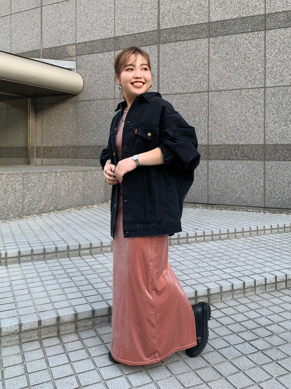 《大人カジュアルコーデ🎀》 今季注目のベロア👀✨ 上品な色味とベロアの生地でトレンド感満載です! ストレートなシルエットのワンピースなので、体のラインを綺麗に見せてくれます◎ ワンピースだけだと大人っぽすぎるなと思ったので、大人気のデニムジャケットを合わせました🫶 ワンピースで体のラインが出るのが気になってしまう方はこのデニムジャケット合わせがおすすめです👍お尻まで隠れる丈感の為、ストレートのワンピースとのバランスがかなり取りやすいです!